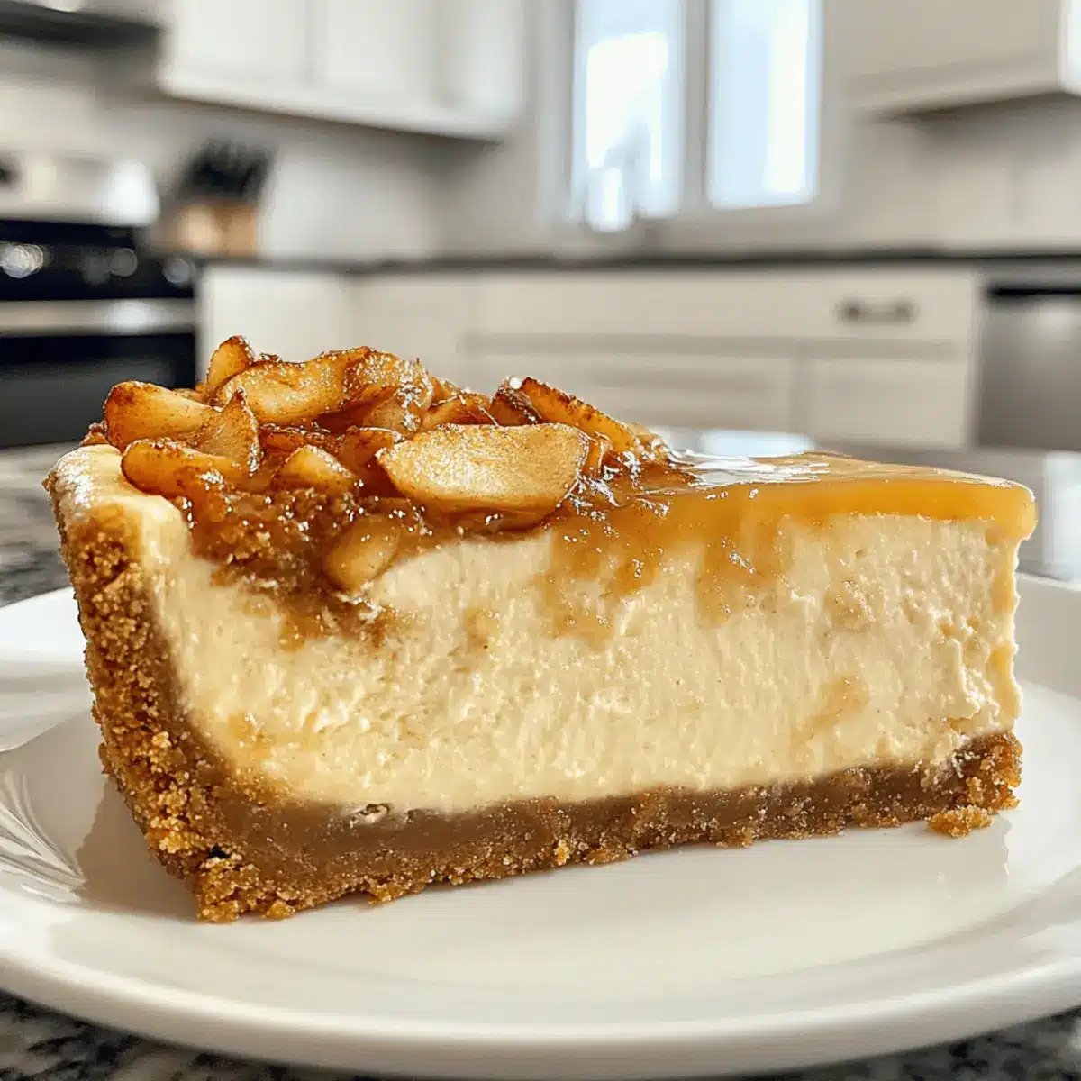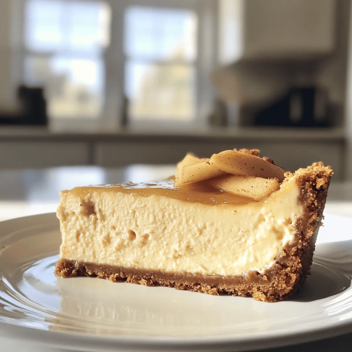 Crisp apple slices offer a crunchy contrast, making each bite of this creamy cheesecake even more satisfying and refreshing. -