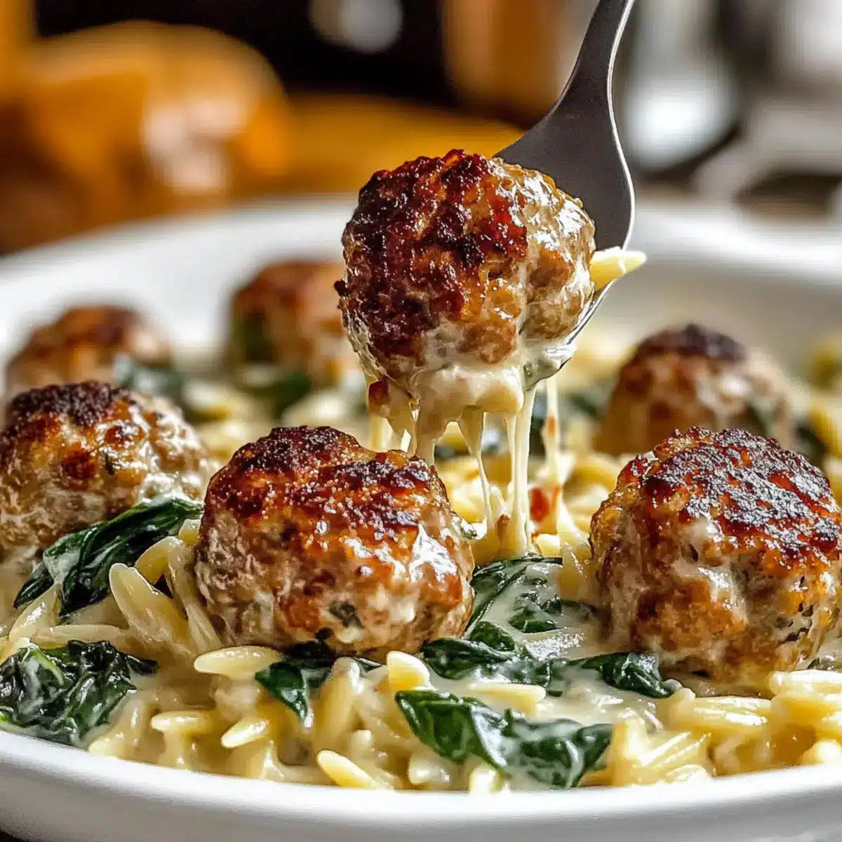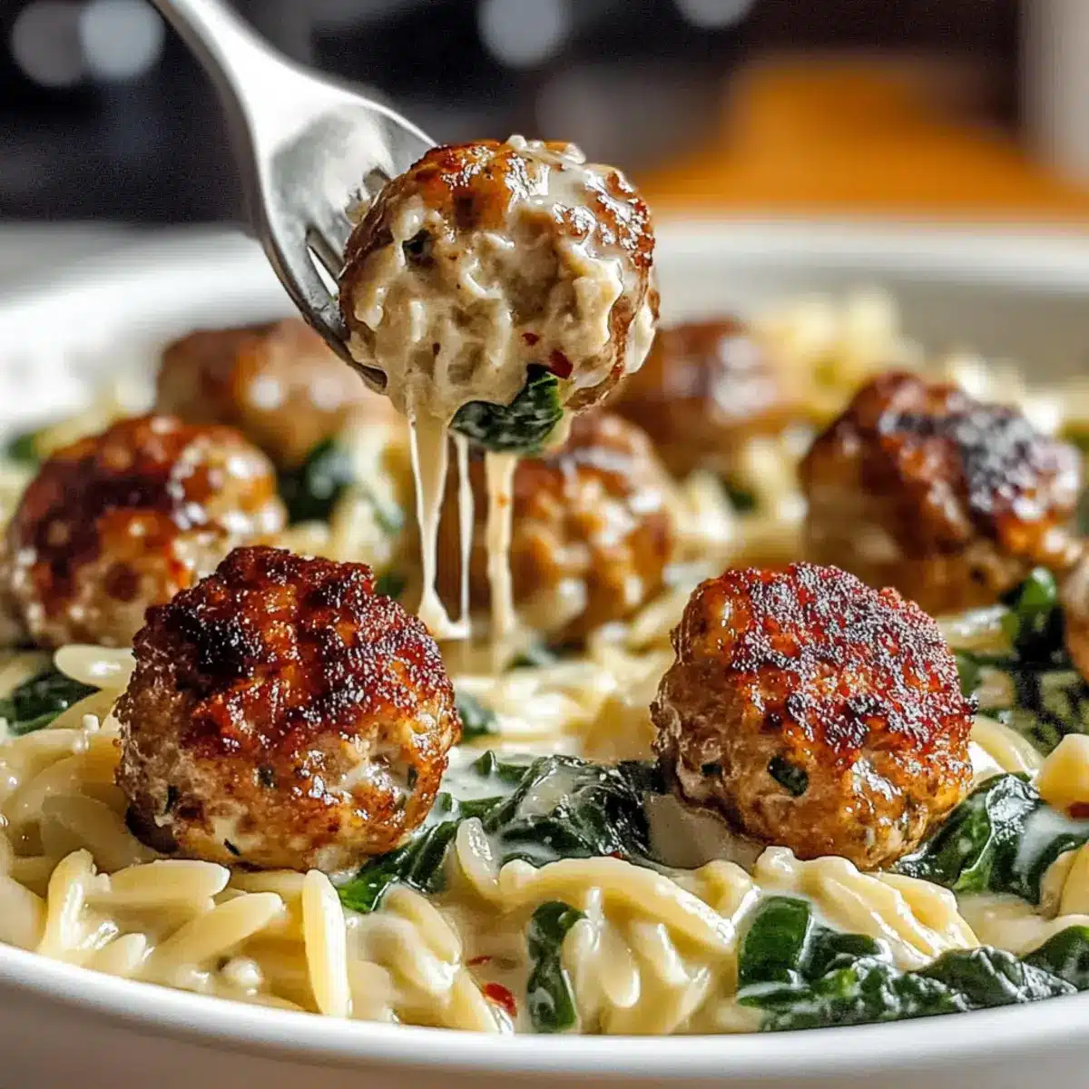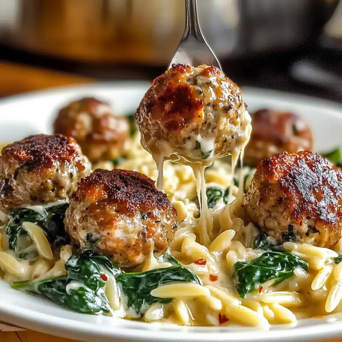 - After resting for 5 minutes, nestle meatballs into the creamy spinach orzo and serve warm.