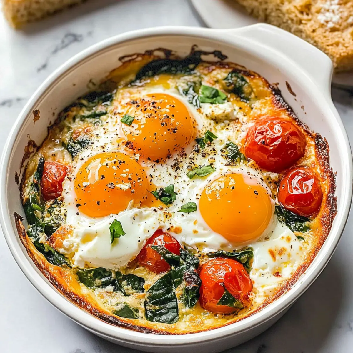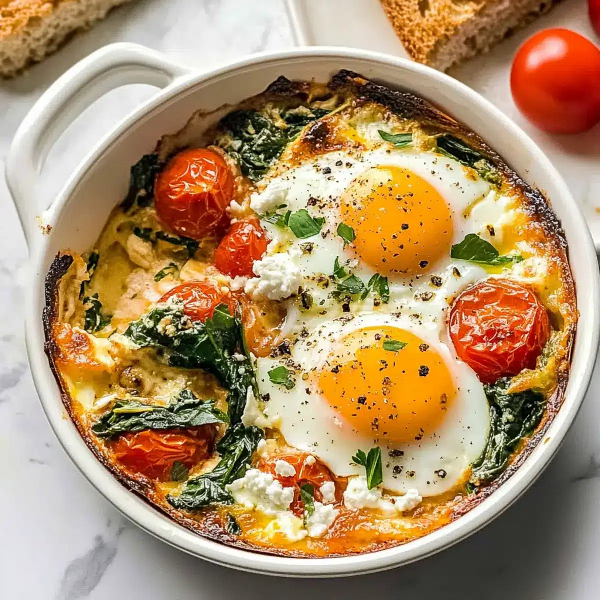 The aroma of baked garlic and feta wafts through my kitchen, transporting me to a sun-drenched Mediterranean patio. Today, I’m bringing you my luscious Baked Feta Eggs with Spinach and Tomatoes—a dish that redefines breakfast and brunch. This vibrant, healthful meal combines creamy feta, juicy tomatoes, and wilted spinach, creating a hearty, low-carb experience that’s perfect for busy mornings or leisurely weekends. With minimal prep time, you’ll find it’s as simple as it is satisfying. Plus, this recipe opens the door to endless variations, letting your culinary creativity shine! How about giving it a try and discovering your favorite twist on this delightful dish?