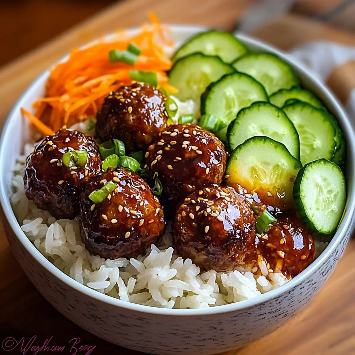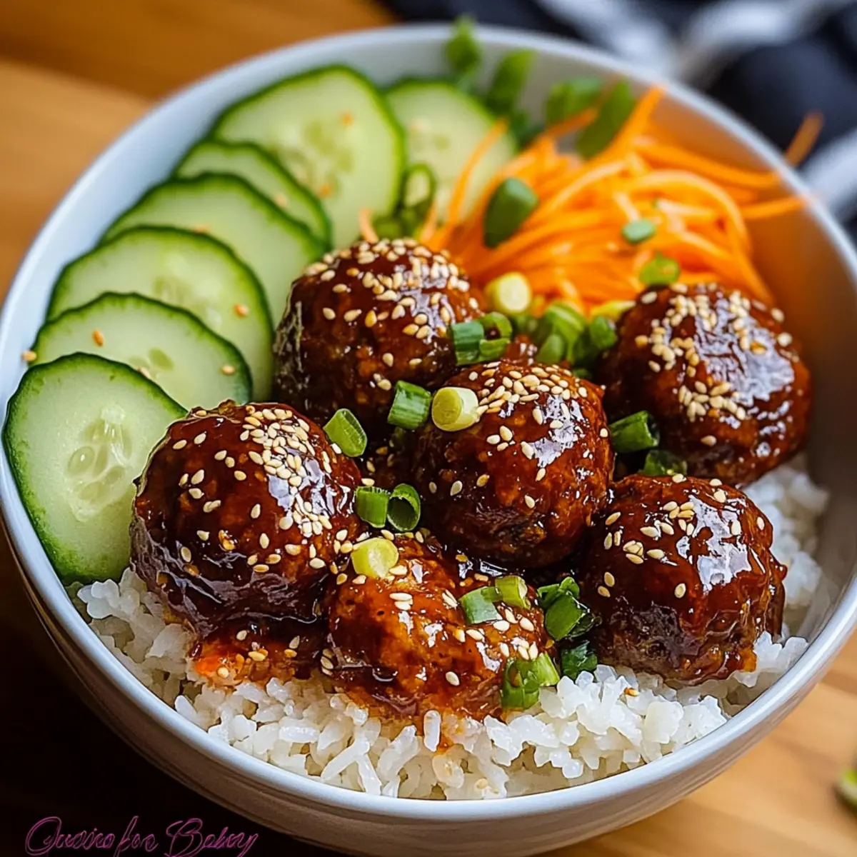 - To assemble, place cooked jasmine rice in bowls, layer glazed meatballs, cucumber slices, and shredded carrots. Drizzle with spicy mayo and garnish with green onions and sesame seeds.