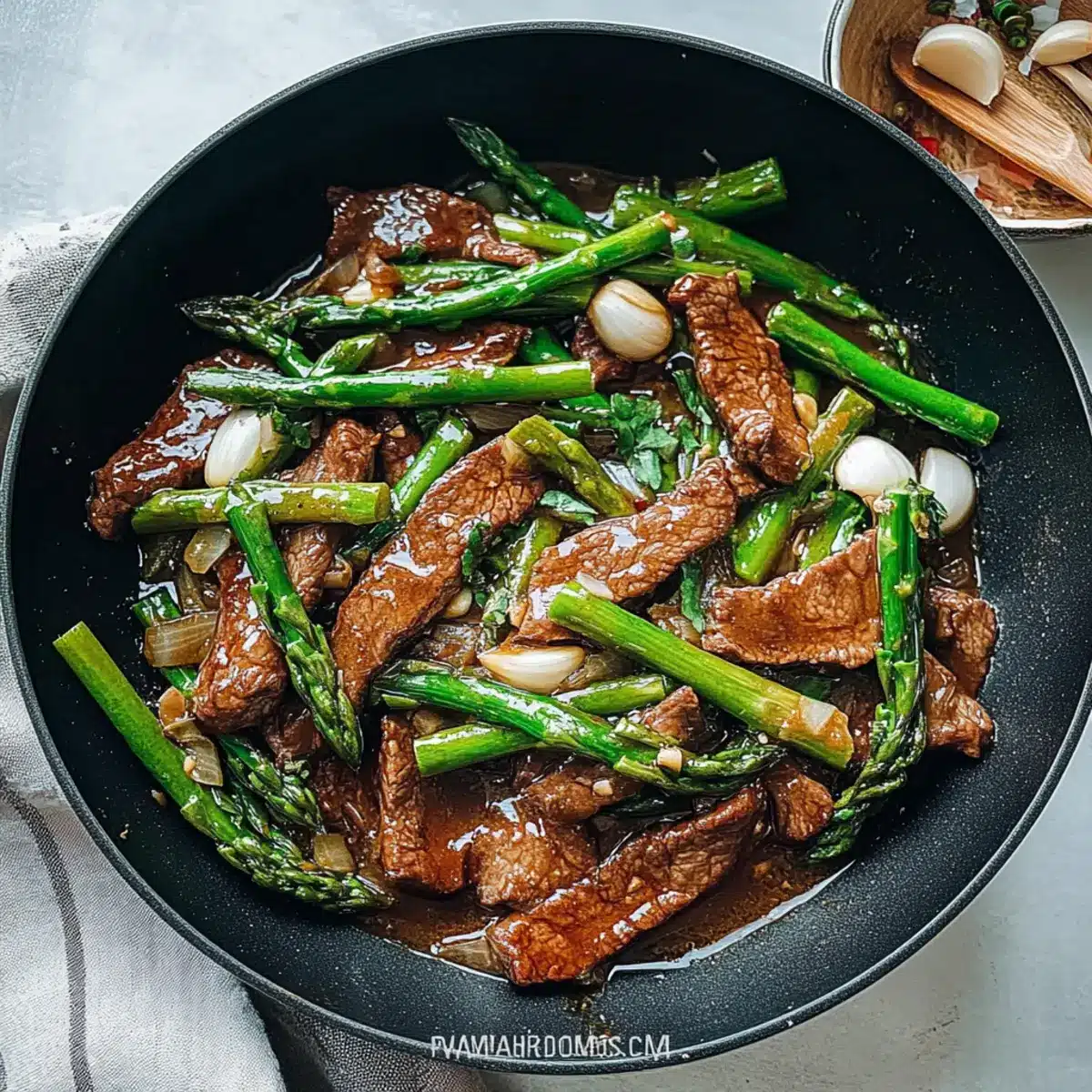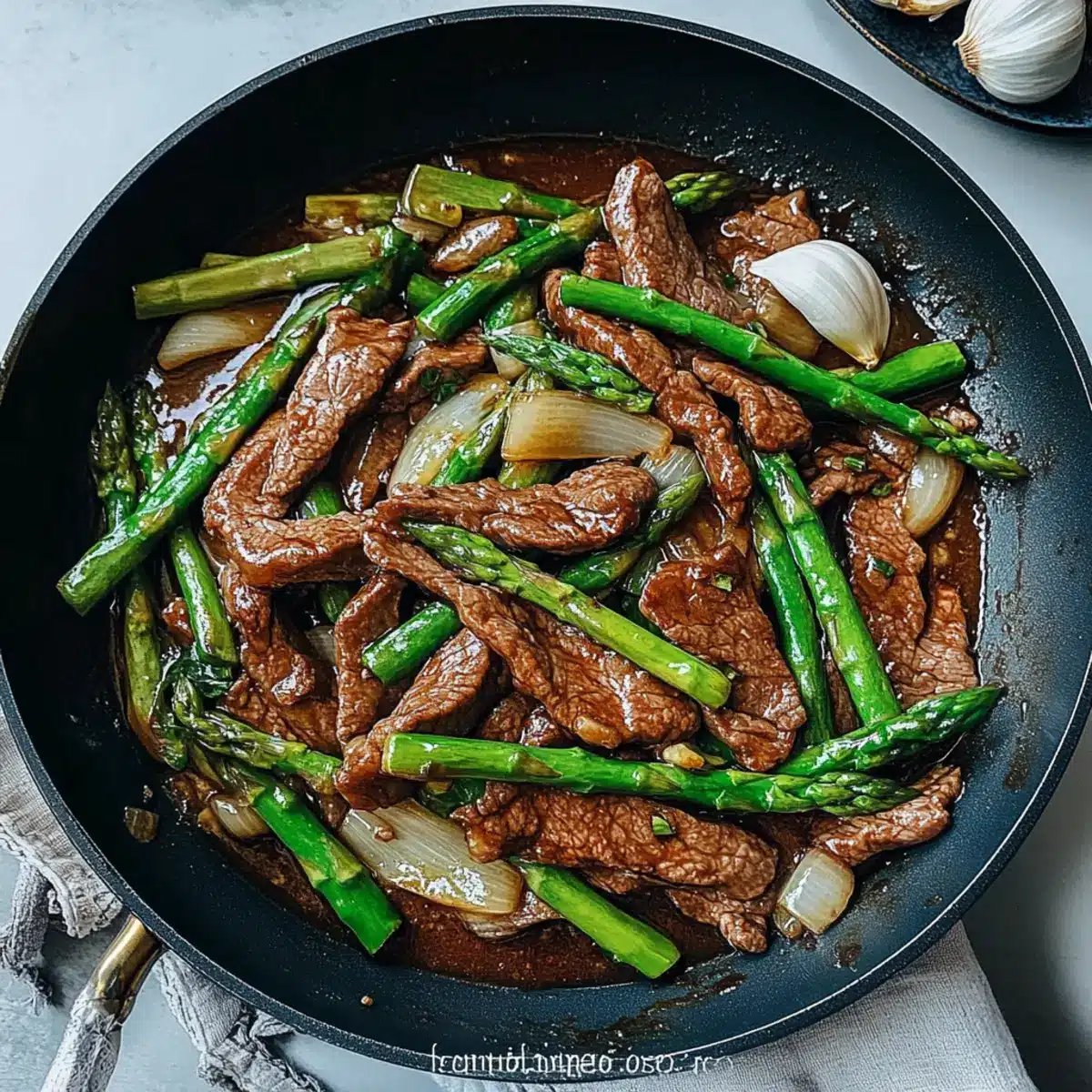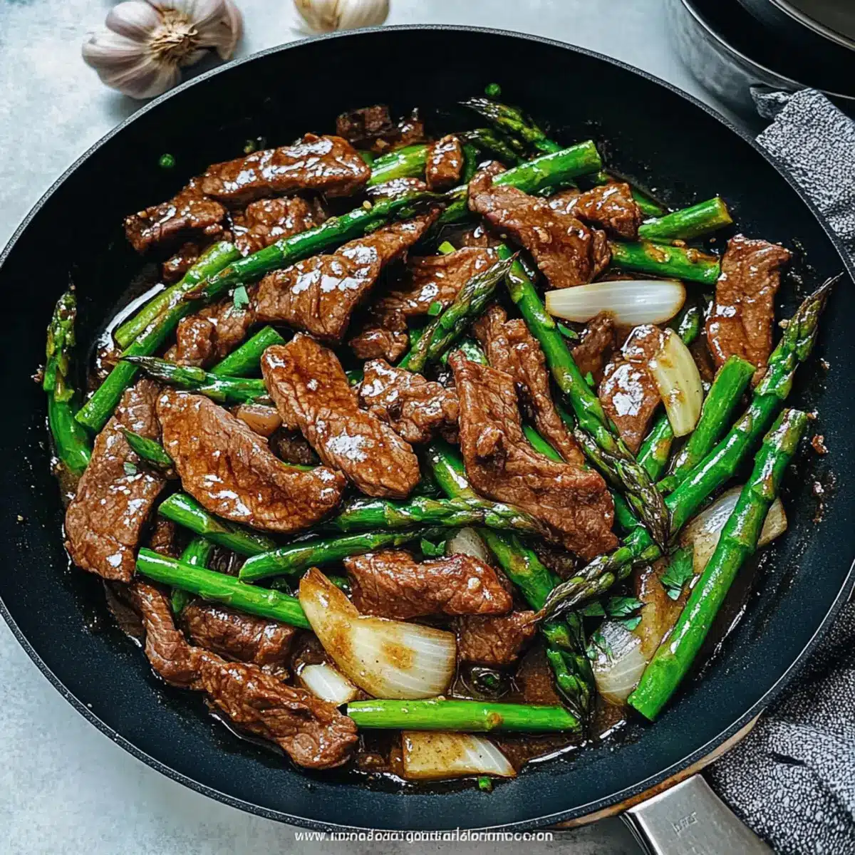Now, add the chopped asparagus to the skillet with the aromatics. Stir-fry them for approximately 1 minute, allowing them to soften slightly while retaining their bright color and crunch. This step adds freshness to the dish, integrating well with the savory beef and sauce.