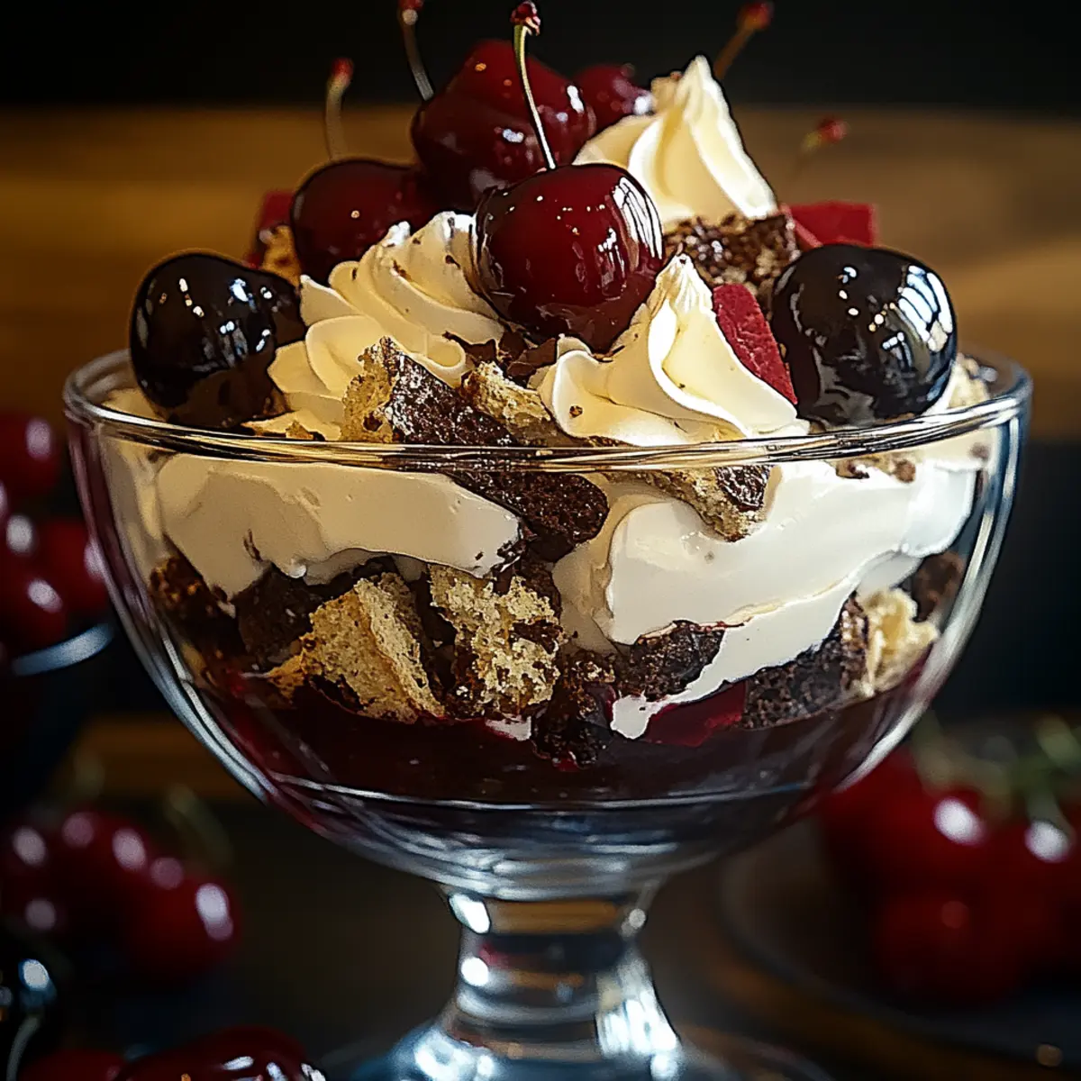 - In a trifle dish, layer the chocolate cake cubes, whipped cream, and cherries. Repeat layers until the dish is filled, finishing with whipped cream.