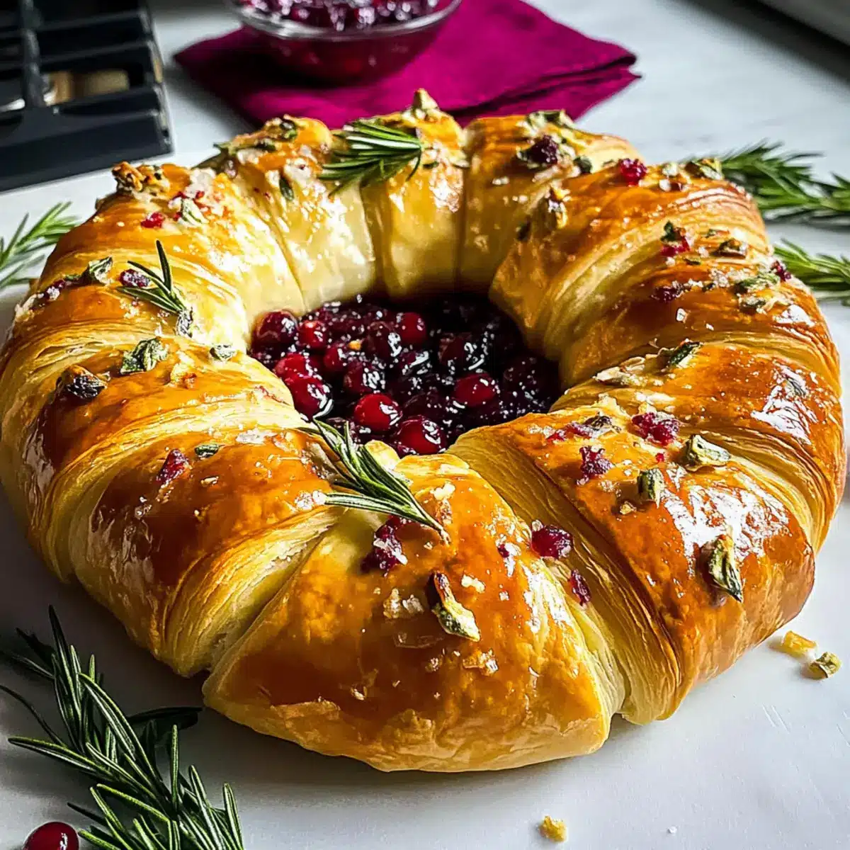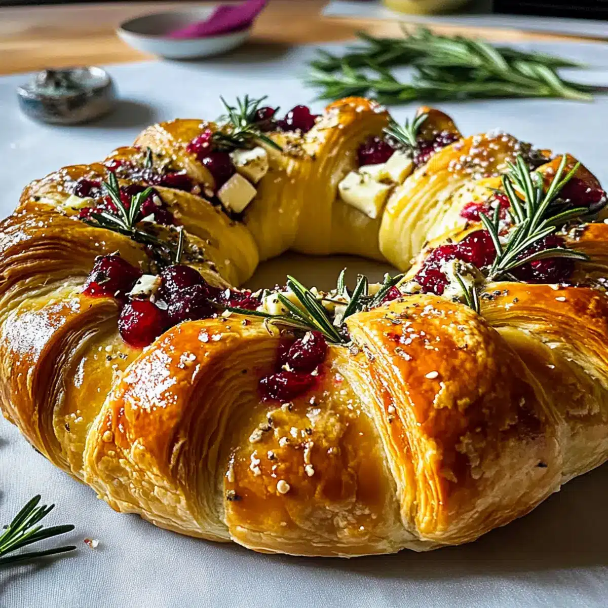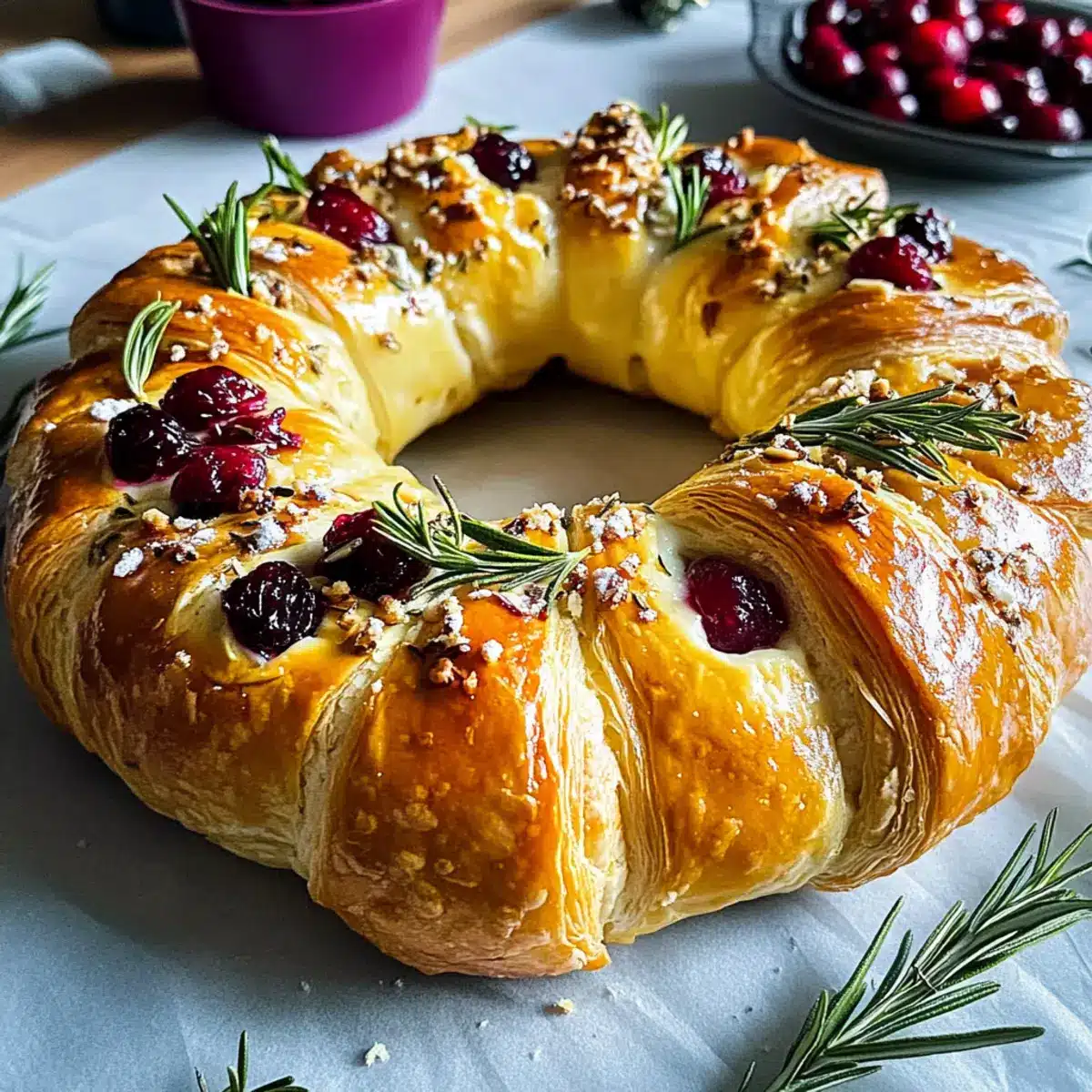 Carefully place the wreath in the preheated oven and bake for 20–25 minutes, or until it turns golden brown and puffs delightfully. Keep an eye on it; you want the pastry to be crisp and flaky while the cheese inside becomes irresistibly gooey.