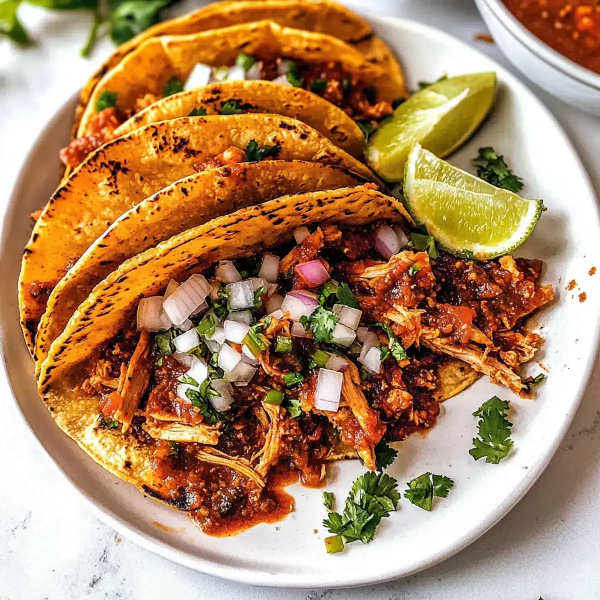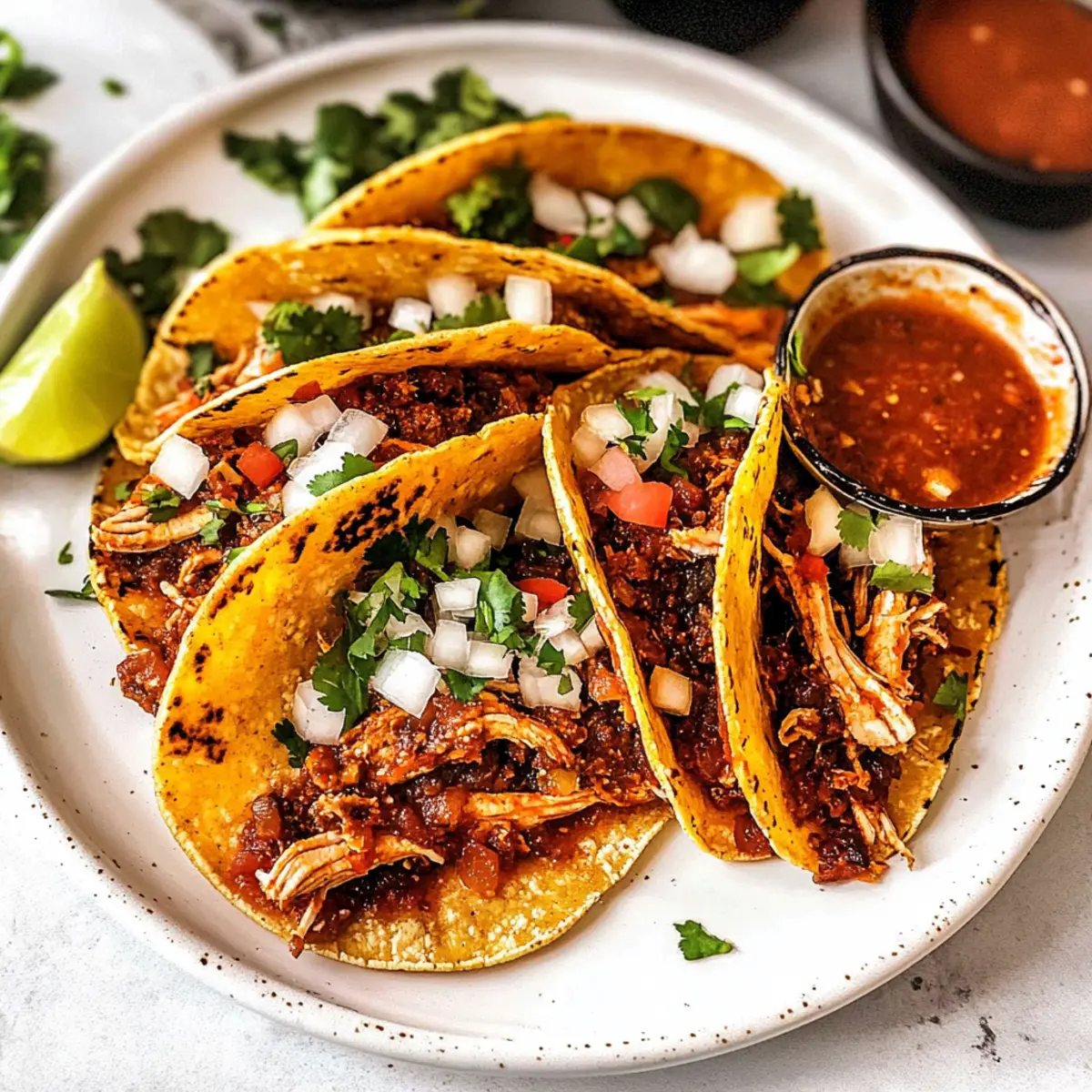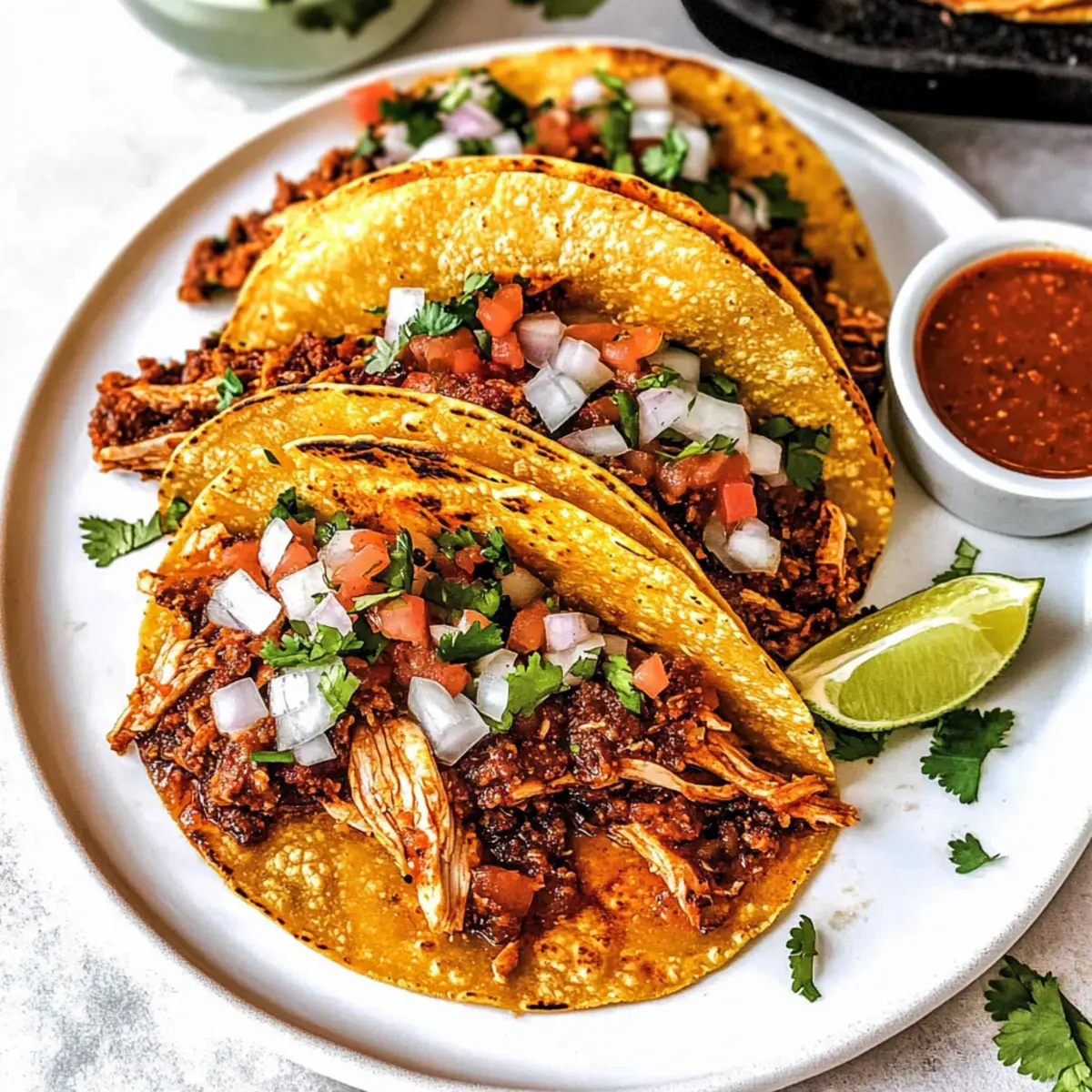 These Chicken Birria Tacos are ideal for meal prep, allowing you to enjoy authentic flavors with minimal stress during the week. You can marinate the chicken with the birria spice mix up to 24 hours in advance, keeping it in the refrigerator to enhance its flavor. Additionally, you can cook and shred the chicken, storing it in an airtight container in the fridge for up to 3 days. When you’re ready to serve, simply heat the shredded chicken in a skillet until warmed through and crisp up the tortillas—this will ensure your tacos maintain their delightful crunch. Assemble the tacos just before serving to keep everything fresh and vibrant!