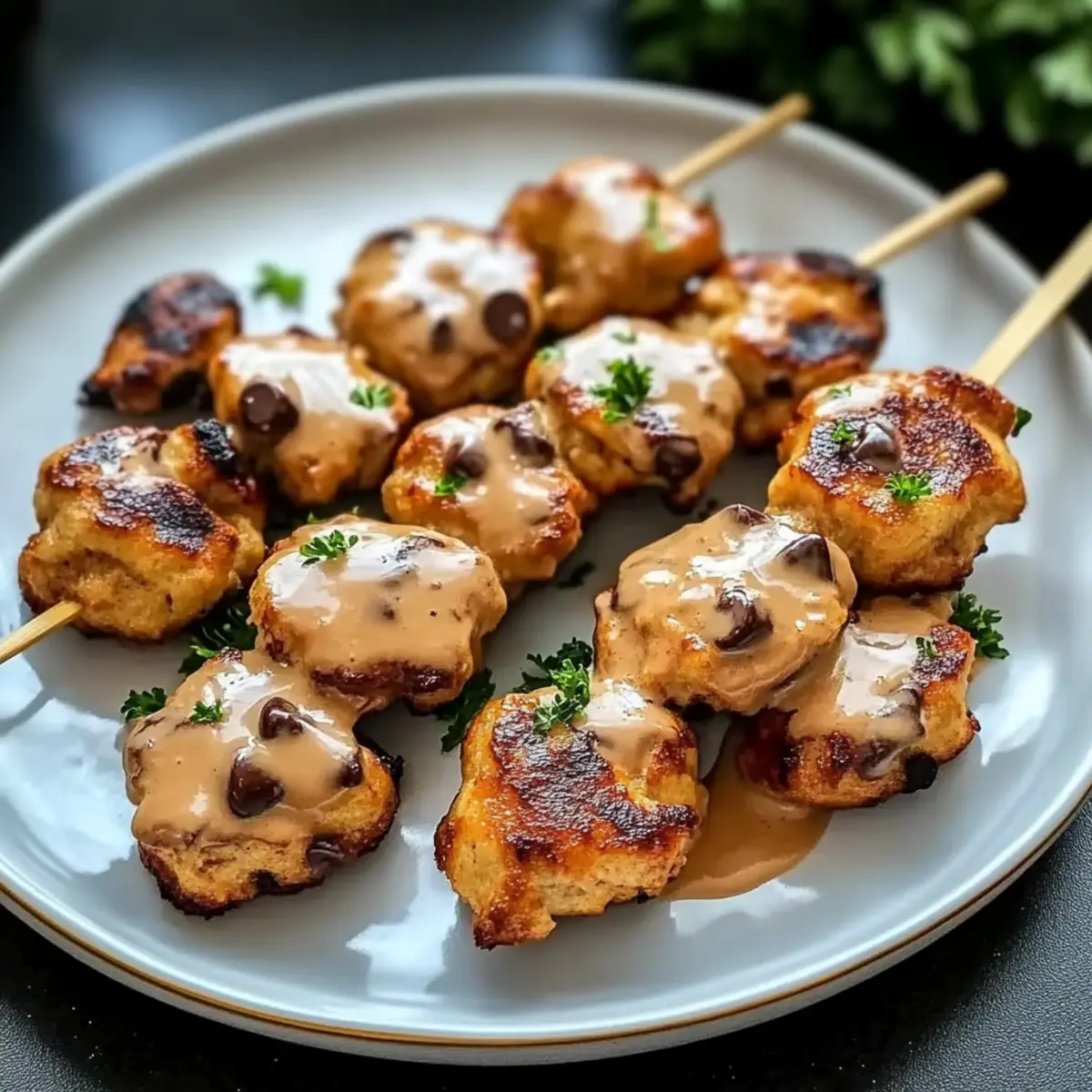 - Serve skewers drizzled with sauce and garnished with chopped green onions.