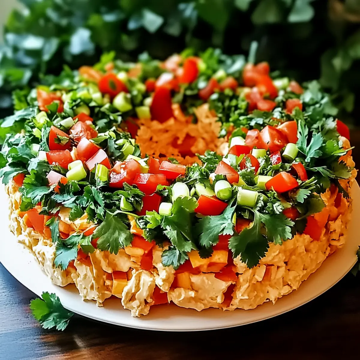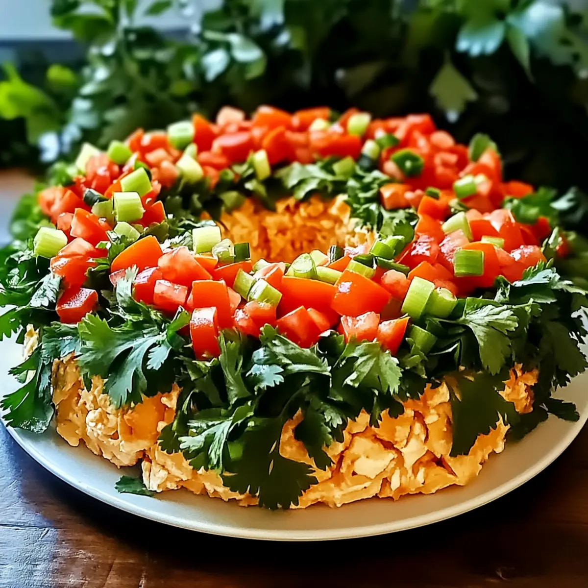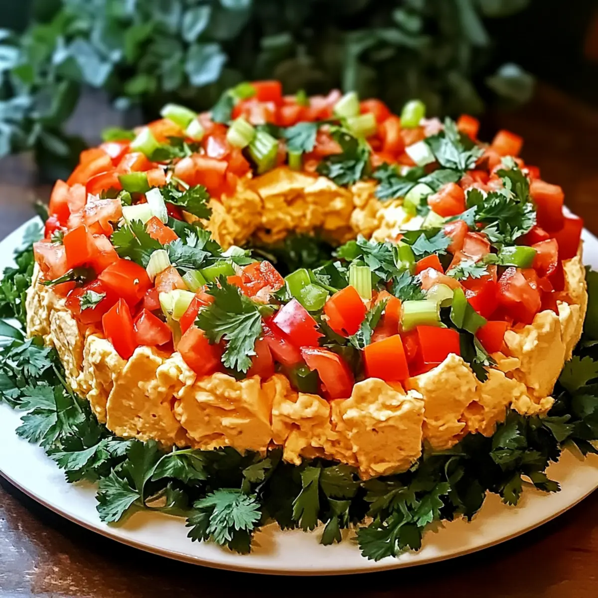 Sprinkle the remaining cilantro on top of the cheese ball wreath for added color and flavor. In a small bowl, combine the diced tomato, finely chopped onion, and jalapeno, then arrange this vibrant mixture around the base of the wreath for a festive and inviting presentation.