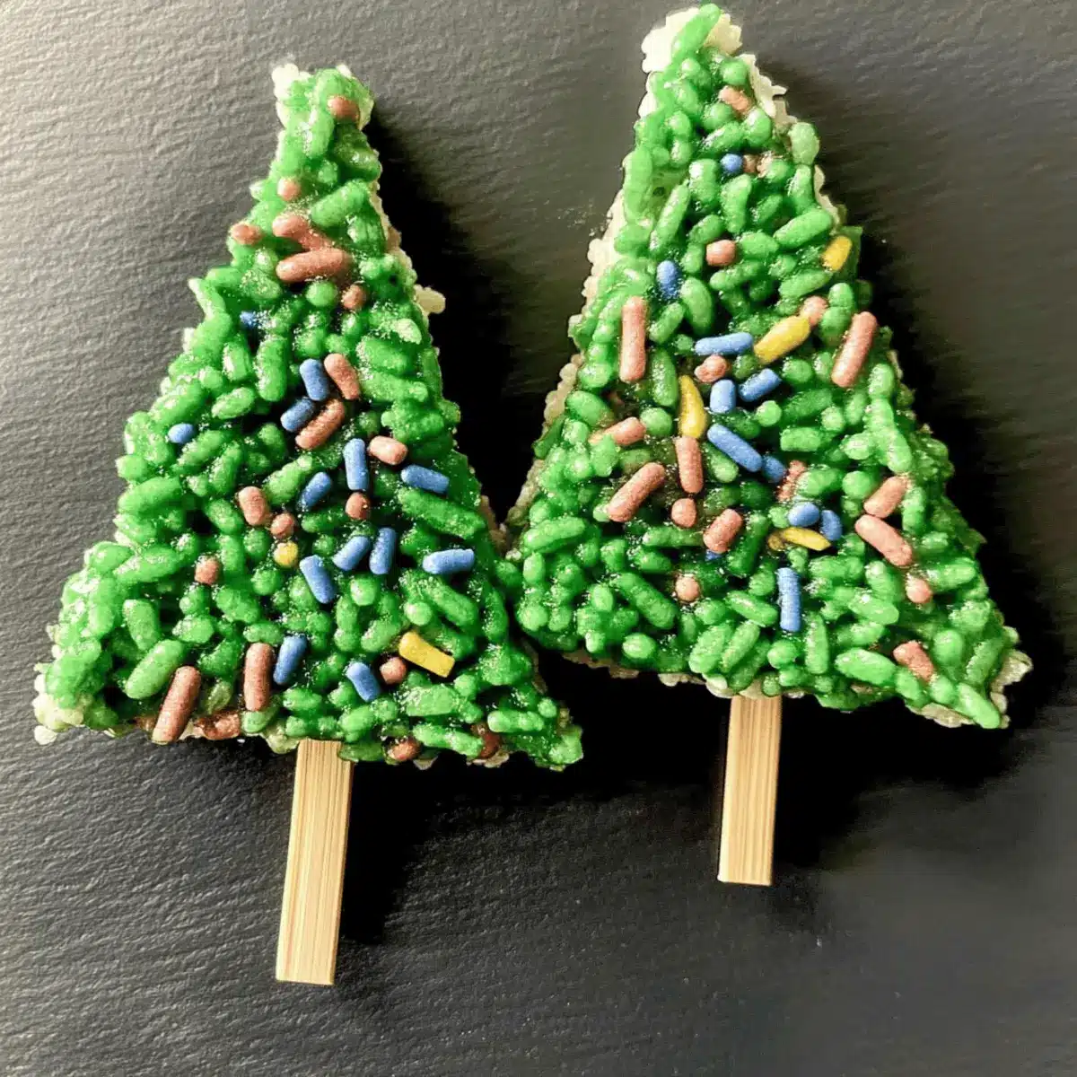 Now comes the fun part! Insert gluten-free pretzel sticks into the base of each tree as trunks. If desired, add vegan sprinkles or other festive toppings to make your Christmas Tree Rice Cereal treats sparkle. This adds a delightful festive touch and makes them even more inviting.
