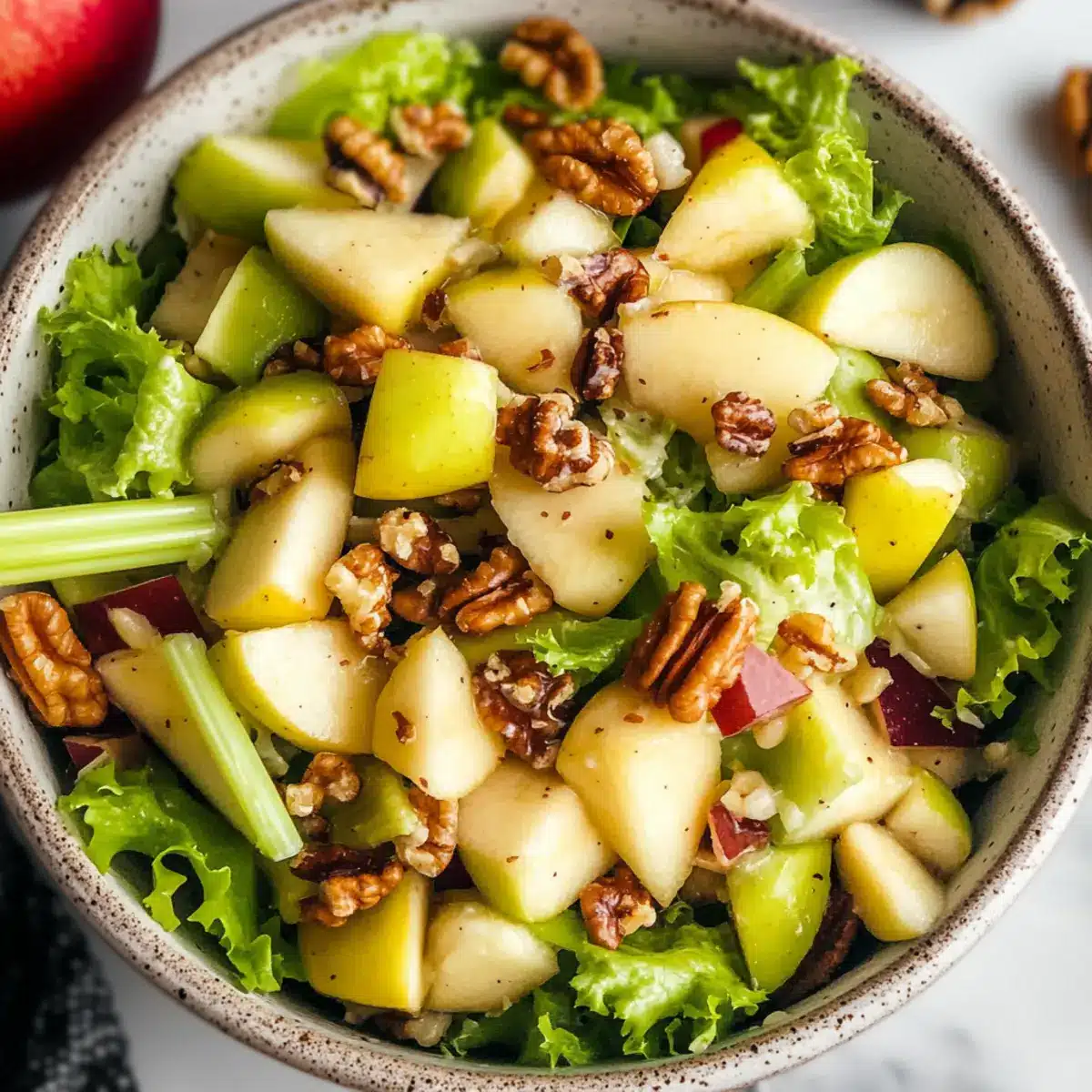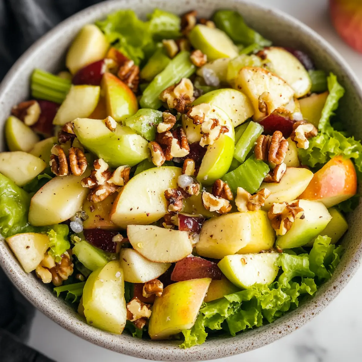 Very! To prevent your apples from browning, make sure to toss them with lemon juice right after cutting. If you’re preparing the salad ahead, keep the apples and dressing separate until just before serving. This trick will keep your salad looking lively!