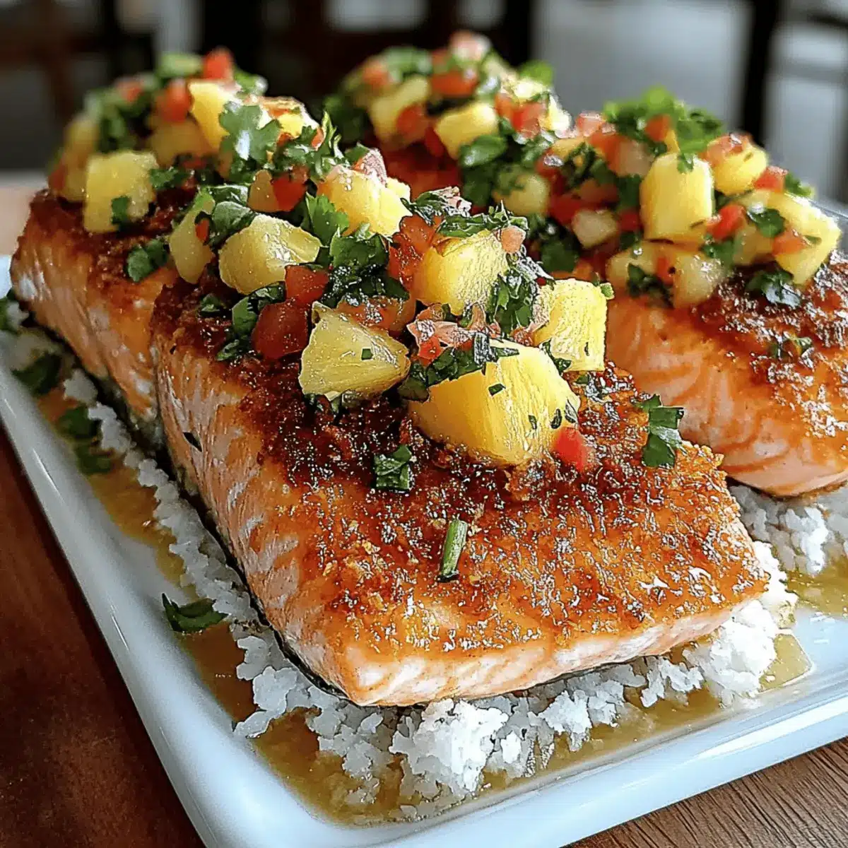 - Serve the cooked salmon topped with the pineapple salsa. Enjoy with steamed jasmine rice or a green salad.