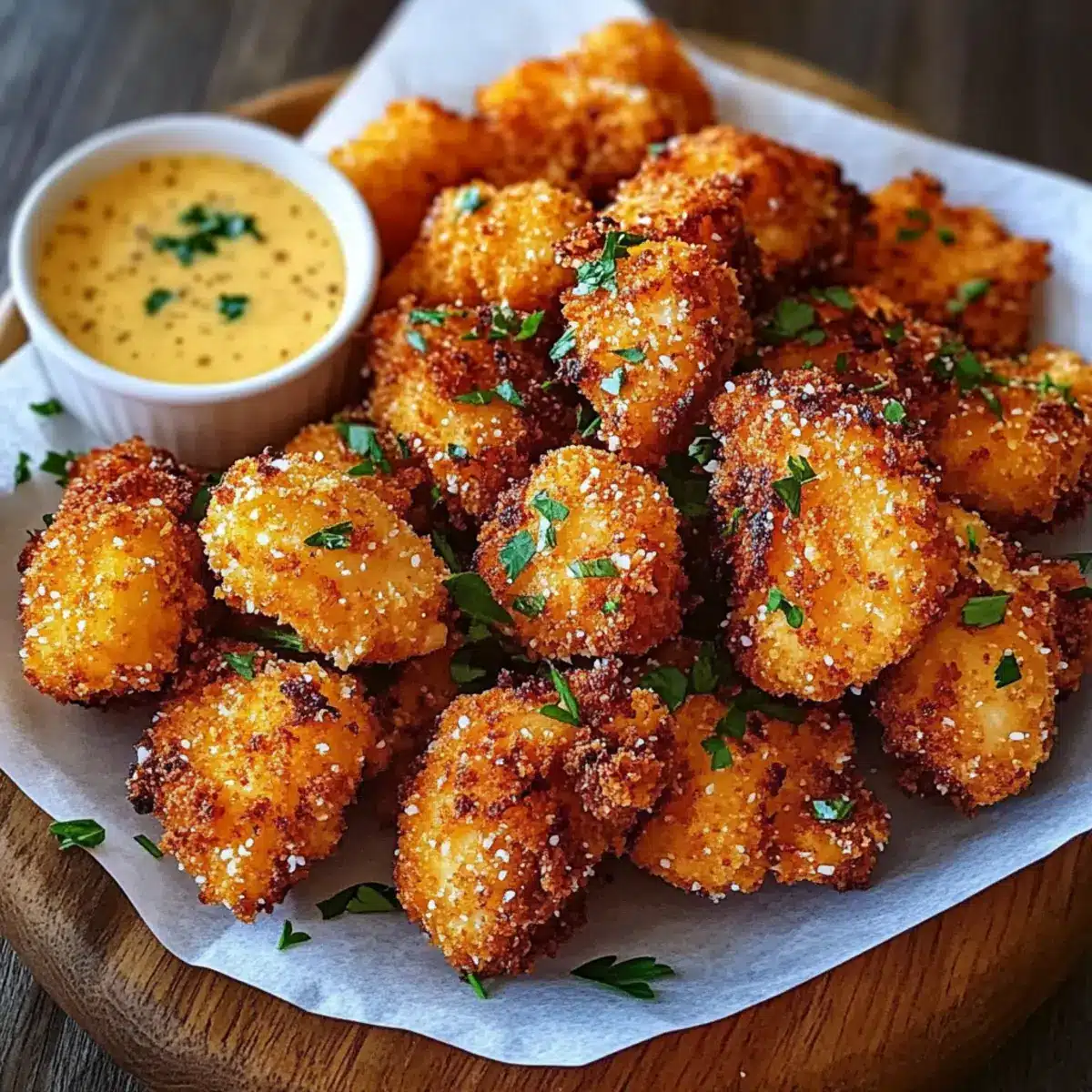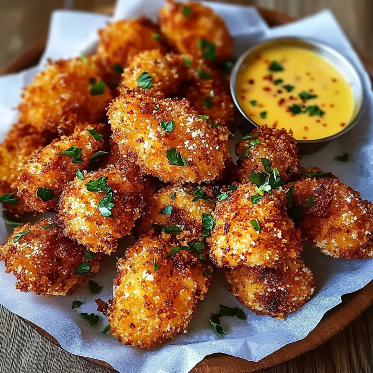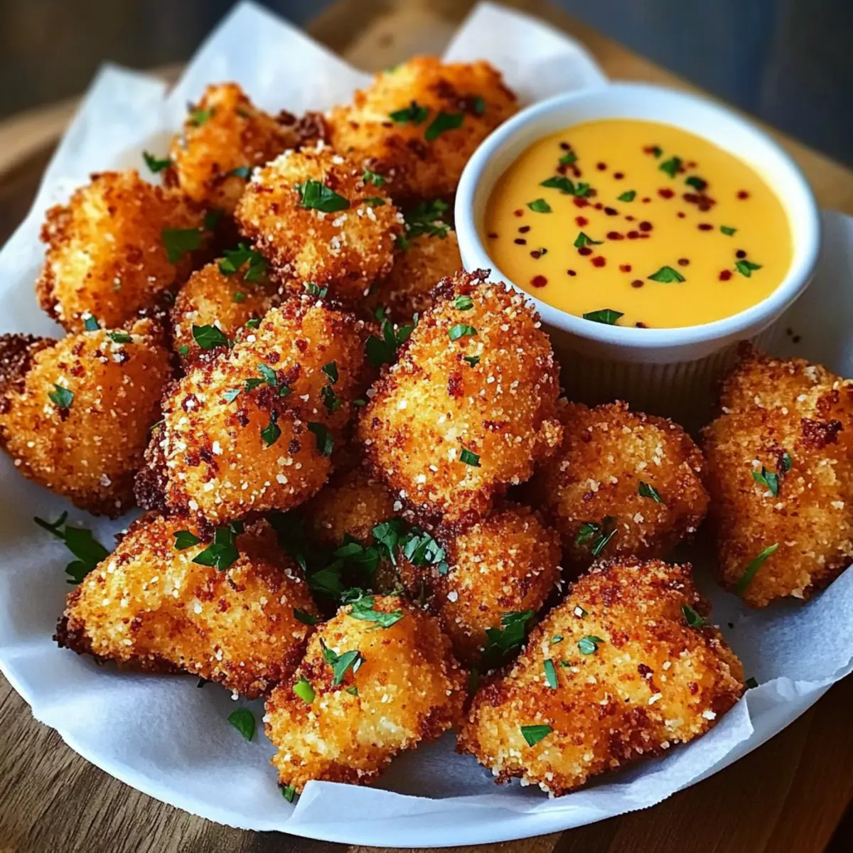 Finally, transfer the Cowboy Butter Chicken Bites to a serving platter lined with parchment paper. Garnish with freshly chopped chives or parsley, and serve alongside lemon wedges and additional Cowboy Butter sauce for dipping. Enjoy the delightful crunch and rich flavors of this crowd-pleasing appetizer!