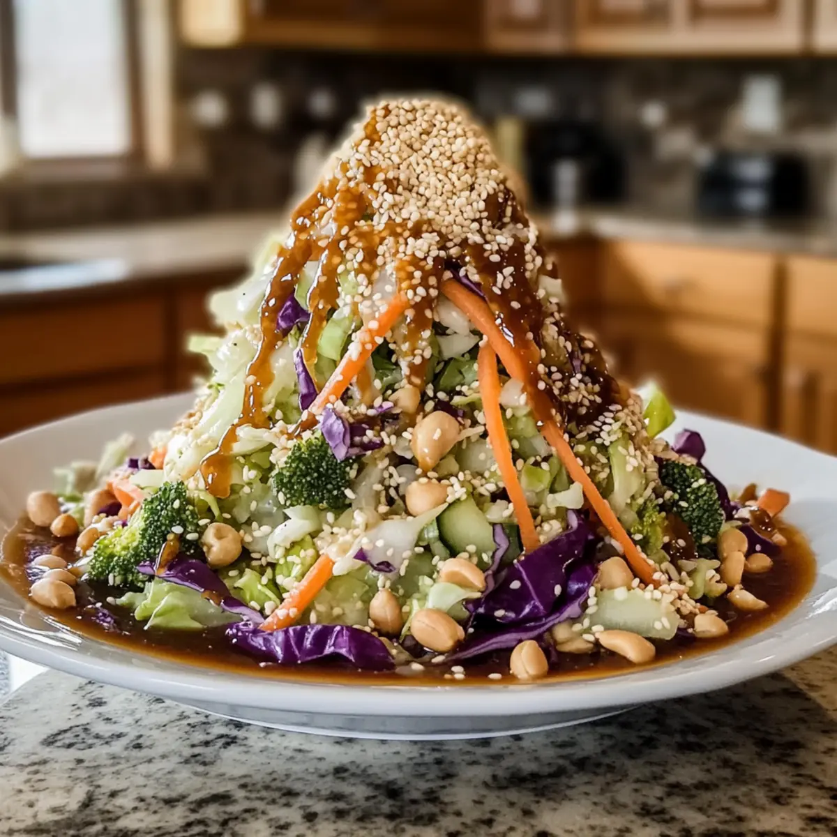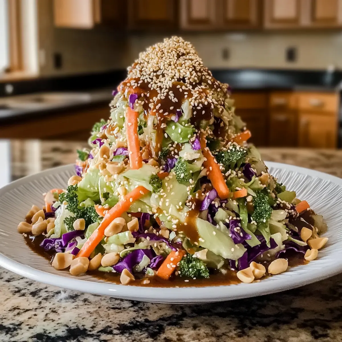 - Sprinkle toasted sesame seeds and chopped peanuts over the slaw. Toss lightly to incorporate toppings without breaking down vegetables.