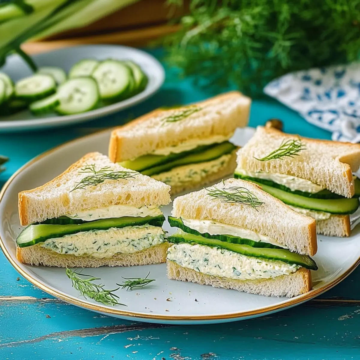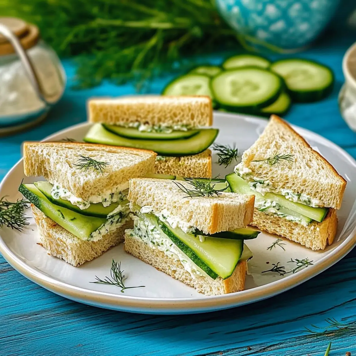 Arrange the cut cucumber sandwiches on a beautiful serving platter, creating an inviting display. For an extra touch of elegance, optionally garnish with leftover dill sprigs or additional cucumber slices. This final presentation will impress your guests, making your classic cucumber sandwiches the highlight of any tea party or brunch!