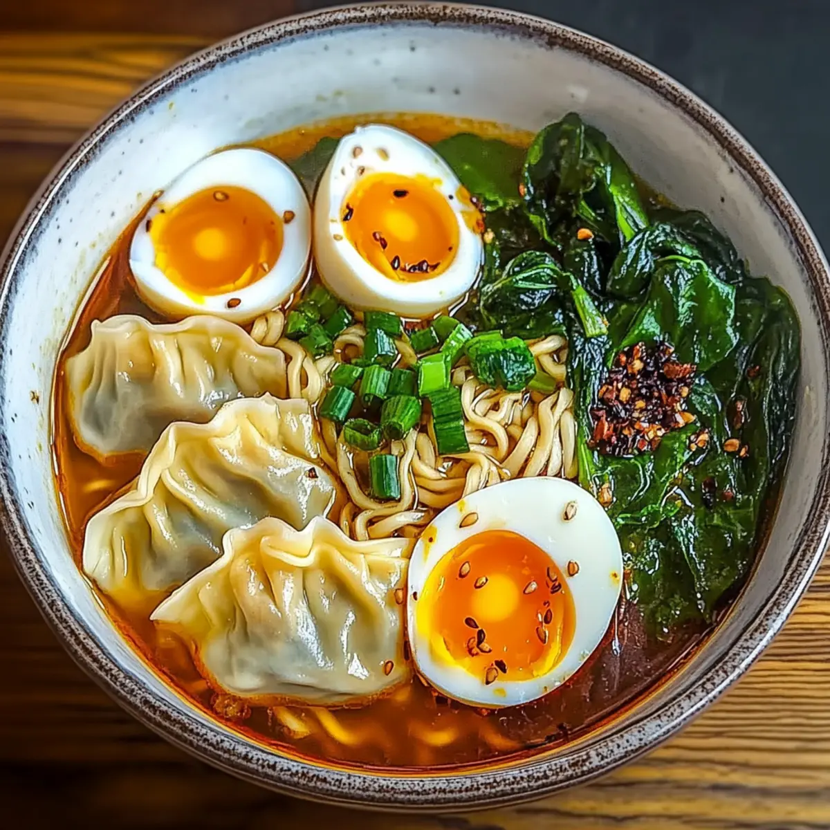 Carefully divide the cooked noodles, dumplings, and spinach among serving bowls. Ladle the hot broth generously over each bowl. Top your Dumpling Ramen Bowl with sliced soft-boiled eggs, a sprinkle of chopped green onions, and optional black sesame seeds for an irresistible finishing touch.