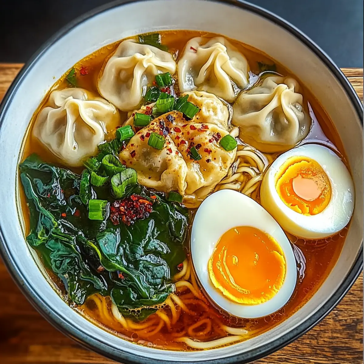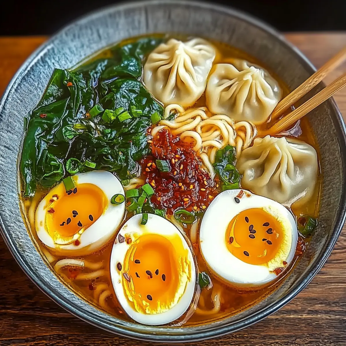 - Step 6: Divide noodles, dumplings, and spinach into bowls, ladle hot broth over, and top with soft-boiled eggs, green onions, and sesame seeds.