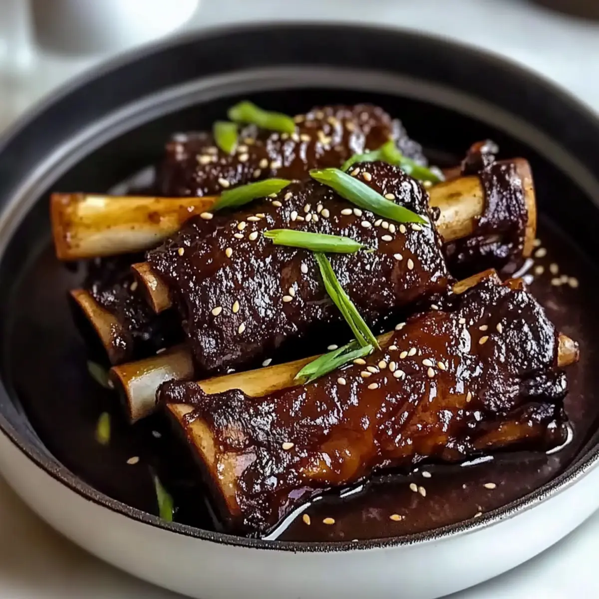 Return the tender ribs to the thickened sauce, ensuring they are warmly coated. Serve your Ginger Miso Braised Short Ribs garnished with sliced green onions and sesame seeds for a pop of freshness and texture. Enjoy this heartwarming dish with steamed rice or mashed potatoes to soak up every delicious drop of sauce!