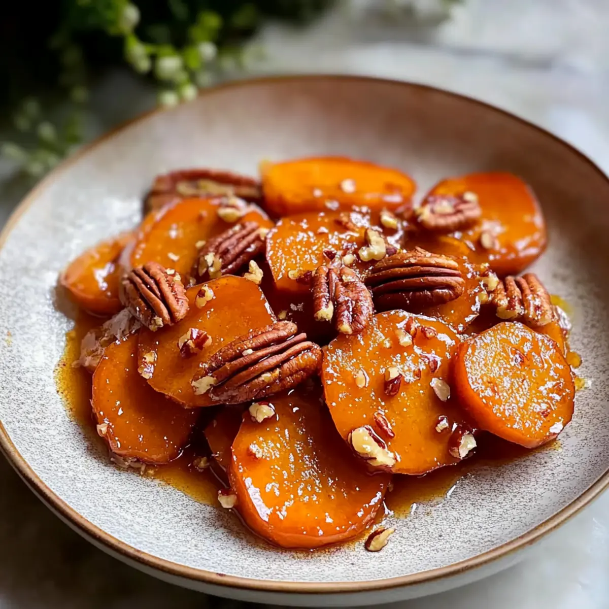 Sprinkle the chopped pecans over the glazed yams, distributing them evenly for added crunch and nuttiness. These pecans not only enhance the flavor but also provide wonderful texture, highlighting the delightfully crafted Honey Ginger Candied Yams.