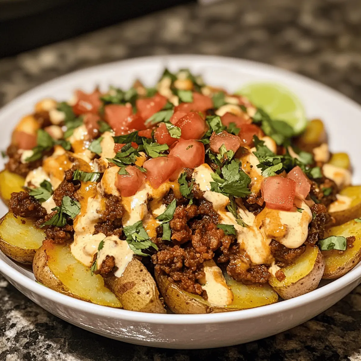To assemble your Loaded Fiesta Potato Bowls, divide the crispy roasted potato slices among individual bowls. Top each serving generously with the seasoned taco meat, then drizzle the rich cheese sauce over the top. Finish by garnishing with fresh lime juice, diced Roma tomato, chopped cilantro, and any additional toppings you desire, such as sour cream or sliced jalapeños. Enjoy your flavorful creation!