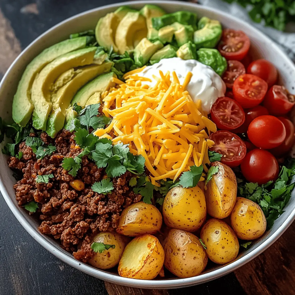 Top each bowl with a sprinkle of shredded cheddar cheese, diced cherry tomatoes, creamy avocado slices, and a handful of fresh cilantro. The cheese will melt slightly from the heat, bringing an irresistible creaminess. Ensure each topping is brightly colored, adding visual appeal to your Loaded Potato Taco Bowl while enhancing the flavor profile.