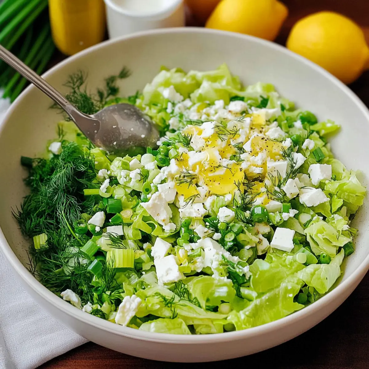 - In a large bowl, add dried romaine, chopped green onions, and dill. Crumble in feta cheese.