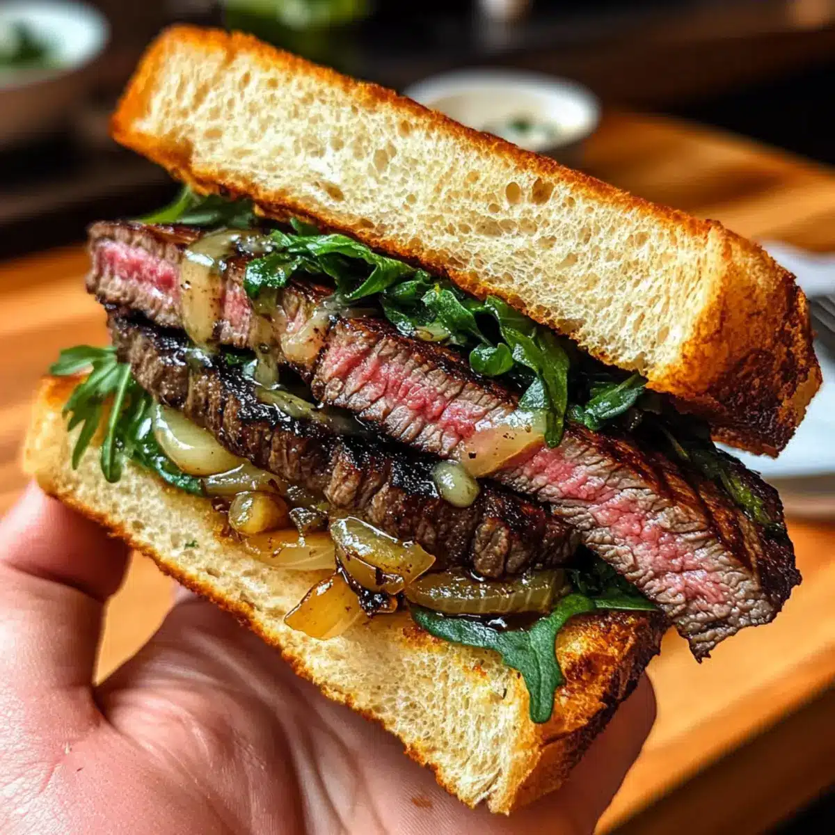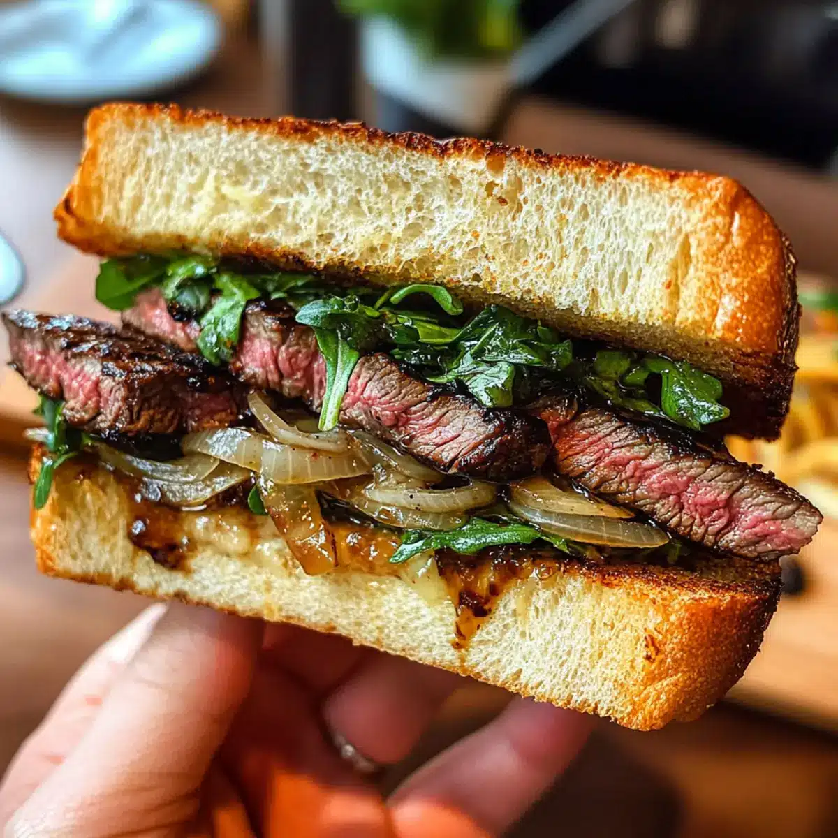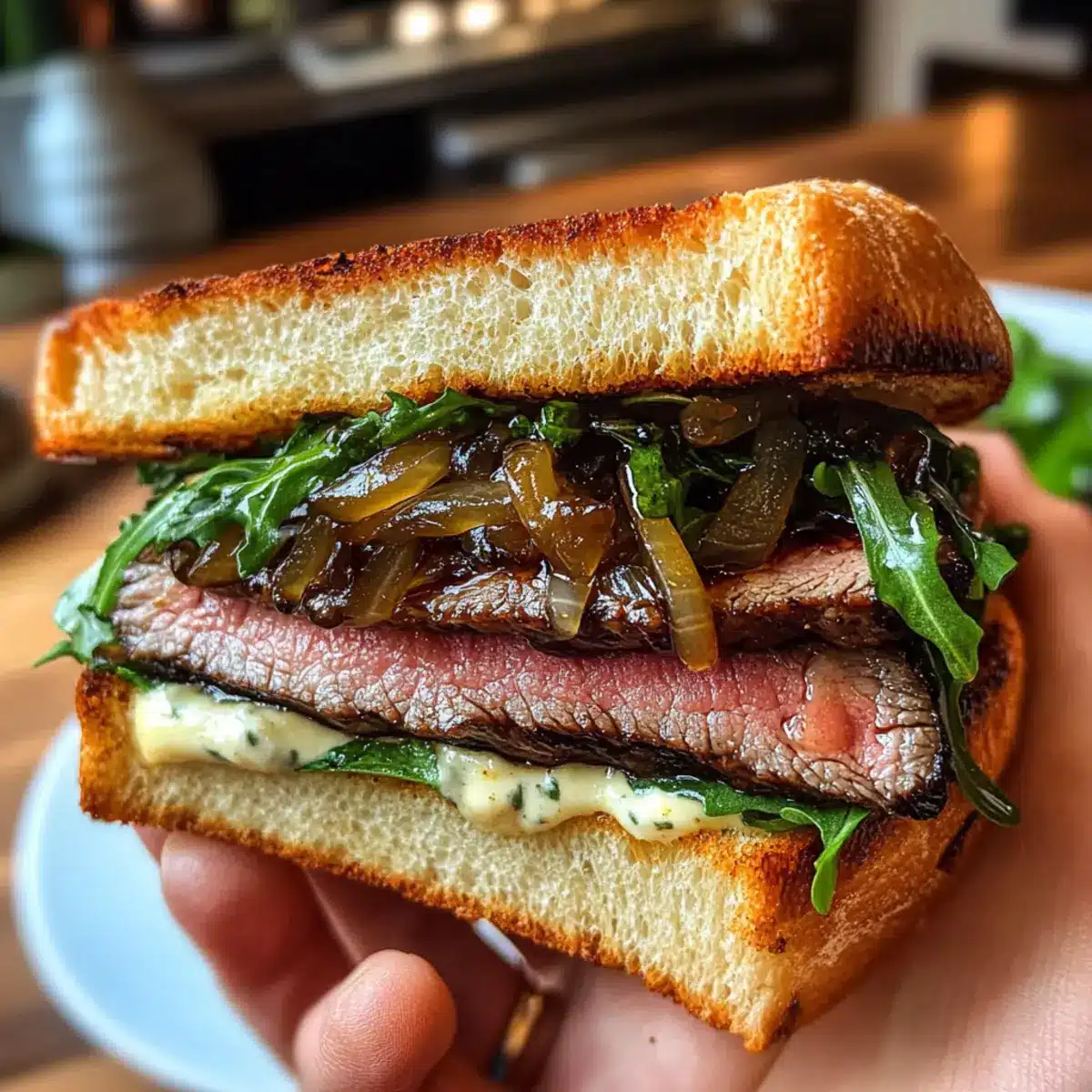 - To assemble, spread a generous amount of zesty lemon herb aioli on both toasted ciabatta halves. Layer on the sliced steak, followed by the sweet caramelized onions, and top with a handful of fresh arugula. Close the sandwich and press gently to hold everything together.