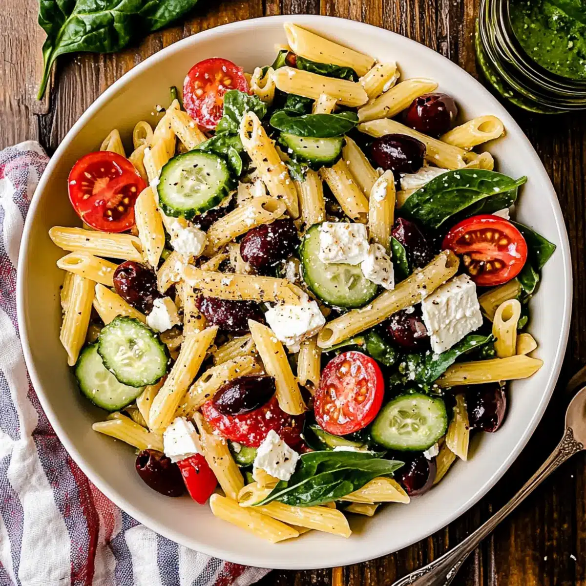 - In a mixing bowl, combine the cooled pasta, halved grape tomatoes, chopped cucumbers, sliced red onion, baby spinach, and olives. Toss gently.