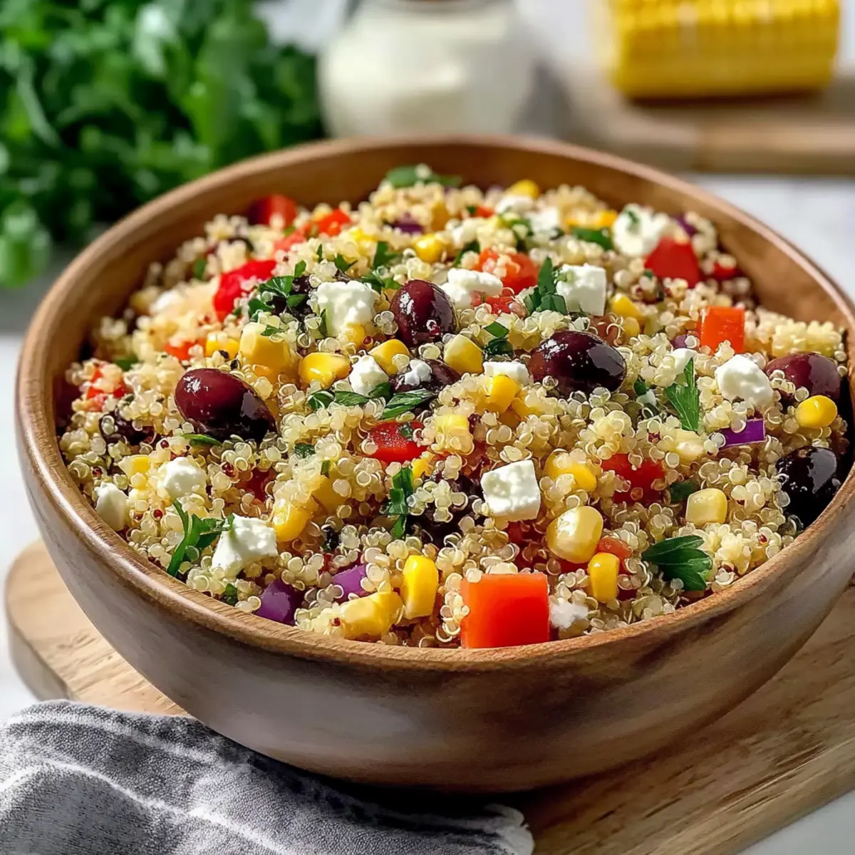 In a large bowl, mix the cooled quinoa with the prepared vegetables, including the corn and feta cheese. Pour the dressing over the mixture and gently toss everything together. This careful combining infuses each bite of the Mediterranean Quinoa Salad with flavor while keeping the ingredients intact and visually appealing.