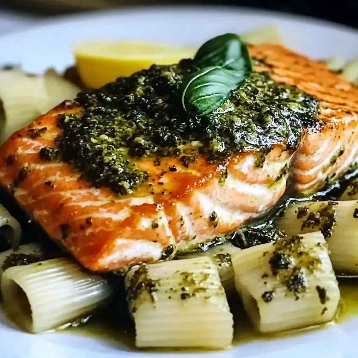 Herbed Pasta: Tossed in olive oil and sprinkled with fresh herbs, pasta adds a filling base that soaks up any extra pesto butter, enhancing every bite of salmon.