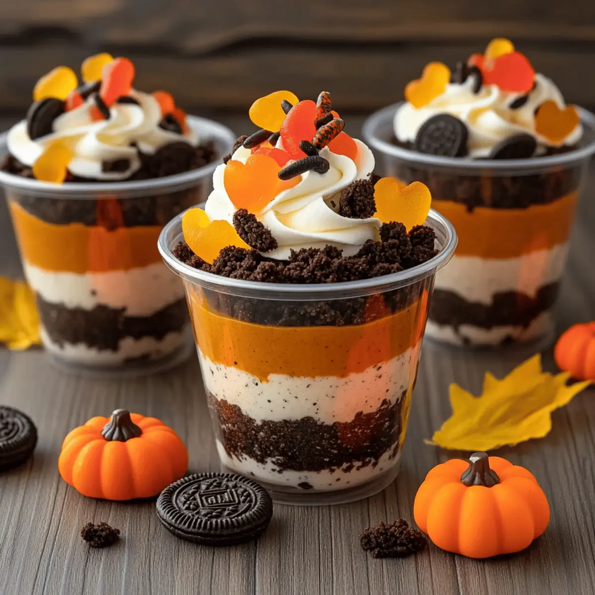 - Decorate and Chill: Decorate each cup with gummy worms and candy pumpkins, then refrigerate for at least 30 minutes.