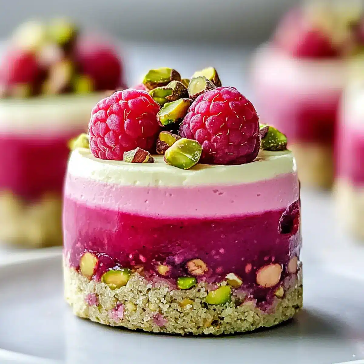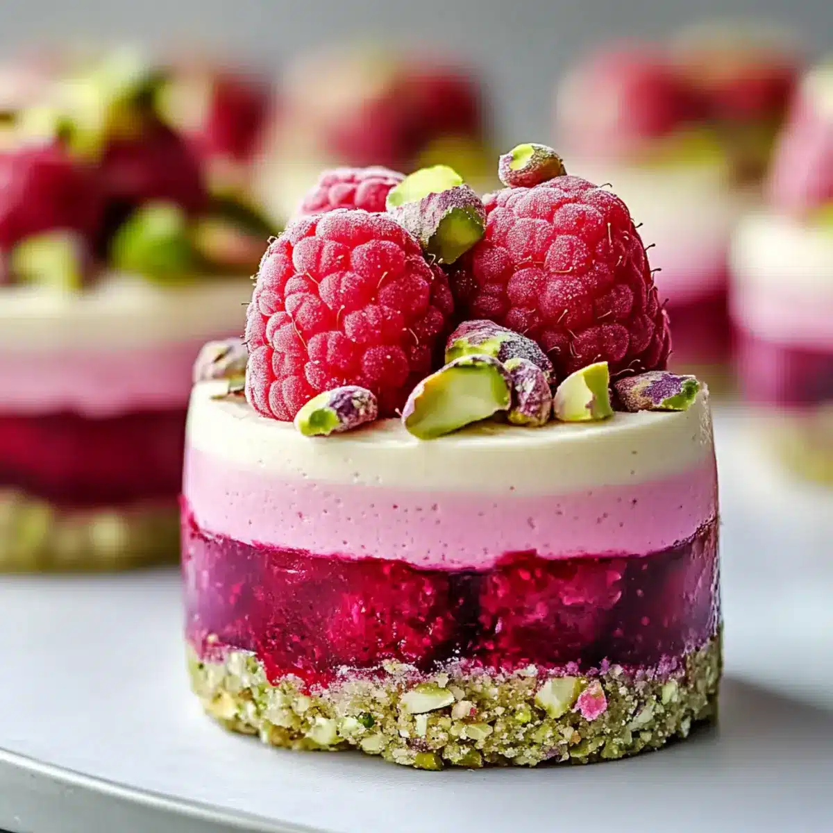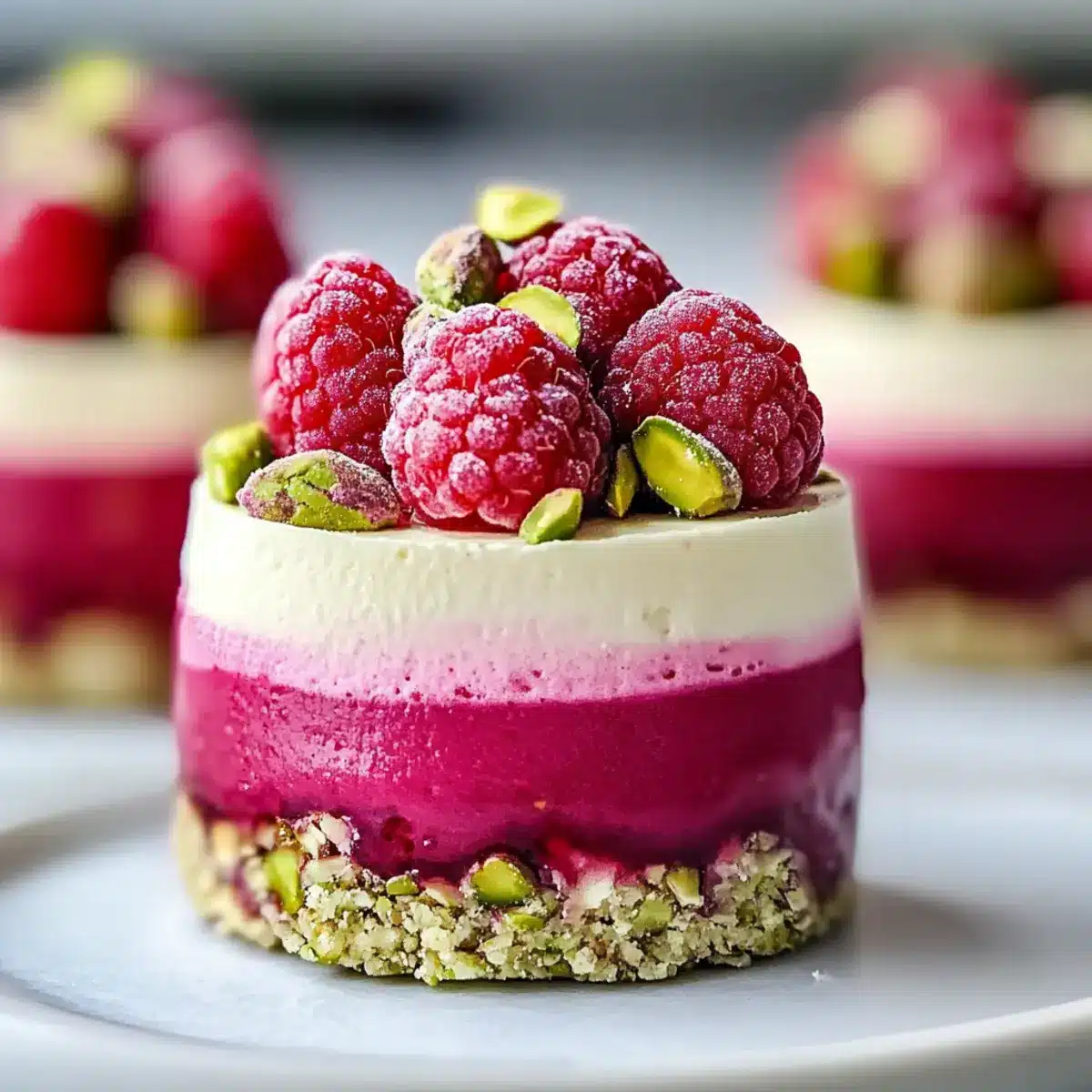 - Garnish with fresh raspberries and additional crushed pistachios before serving.