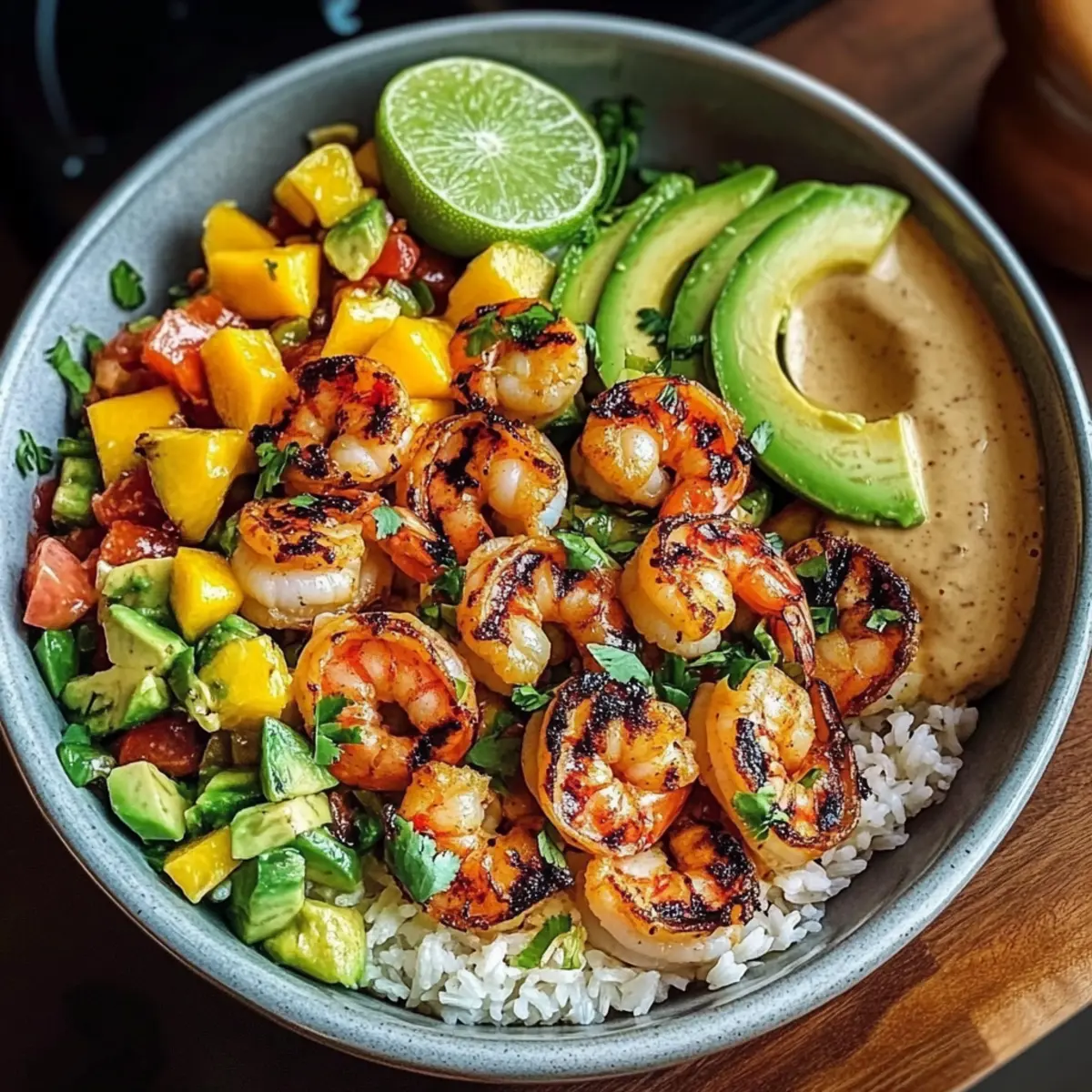 To assemble your Shrimp and Avocado Bowls, start with a generous scoop of warm rice at the bottom of each bowl. Top with grilled shrimp, sliced avocado, and a hearty portion of mango salsa. Drizzle the creamy lime-chili sauce generously over everything, then serve immediately, garnished with lime wedges for an extra zesty kick.