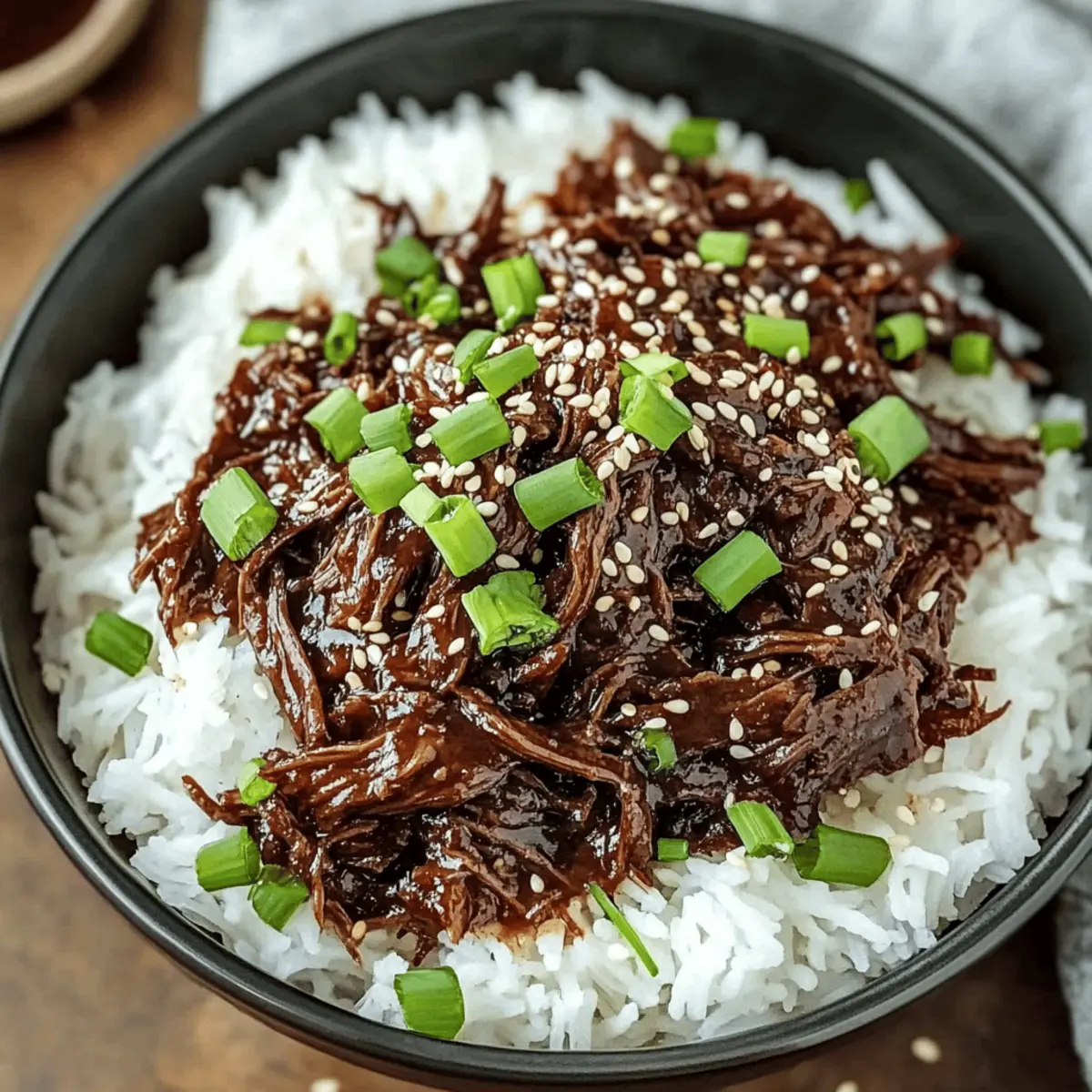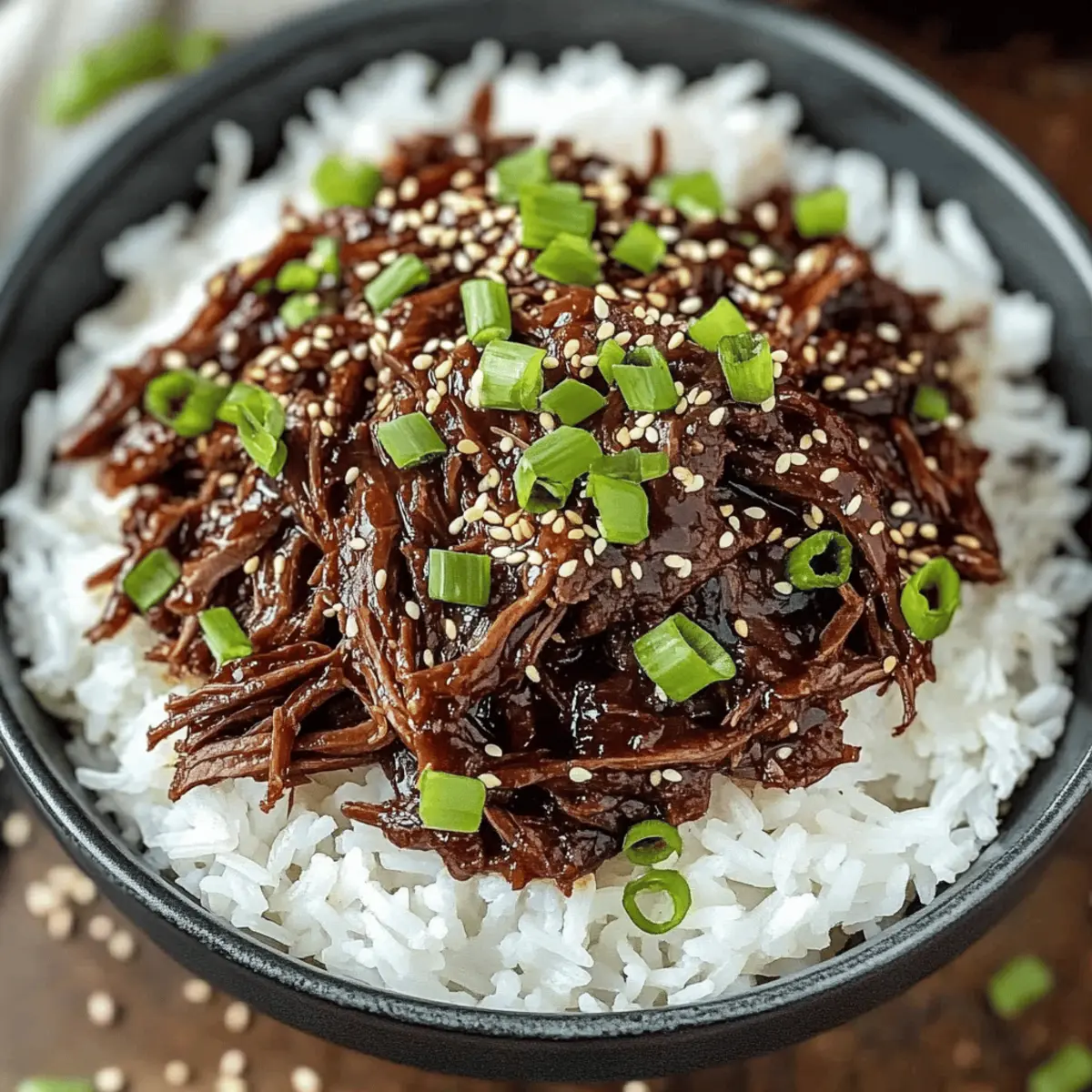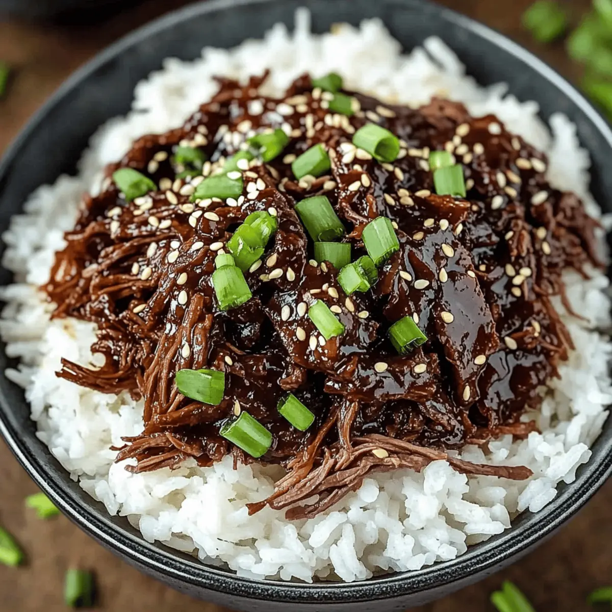 Spoon the tender beef over a bed of fluffy cooked rice, allowing the sticky sauce to blend beautifully with every bite. Garnish with thinly sliced green onions and sprinkle some sesame seeds on top for an added crunch. Serve with kimchi on the side if you desire that traditional Korean touch, enhancing both flavor and presentation!