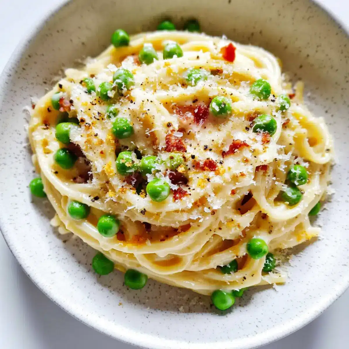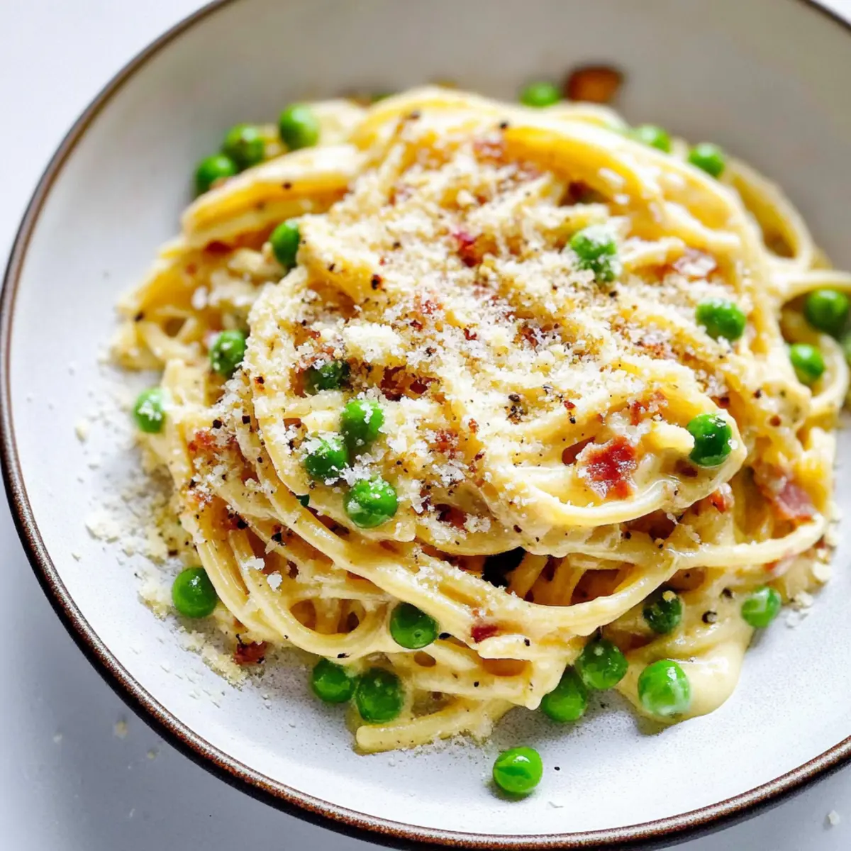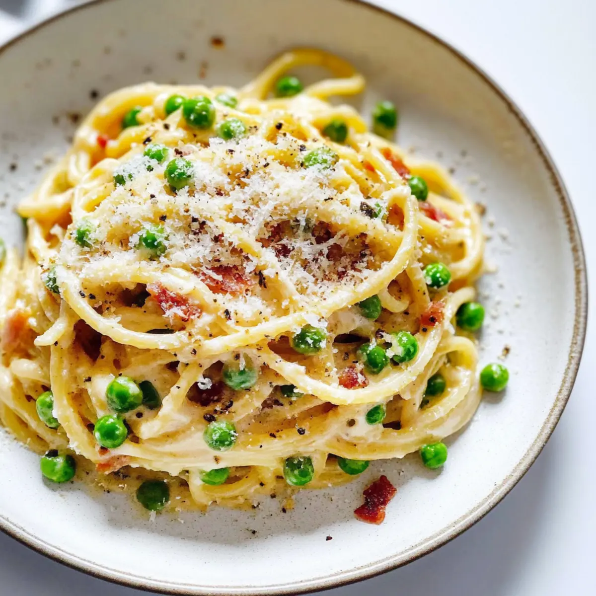 Creamy Spaghetti Carbonara with Sweet Peas and Crispy Pancetta