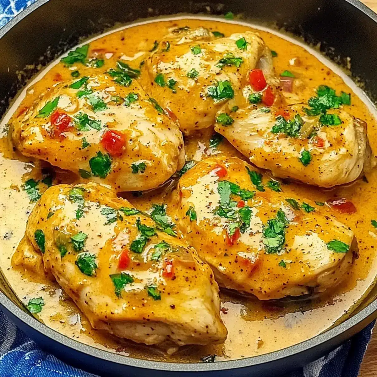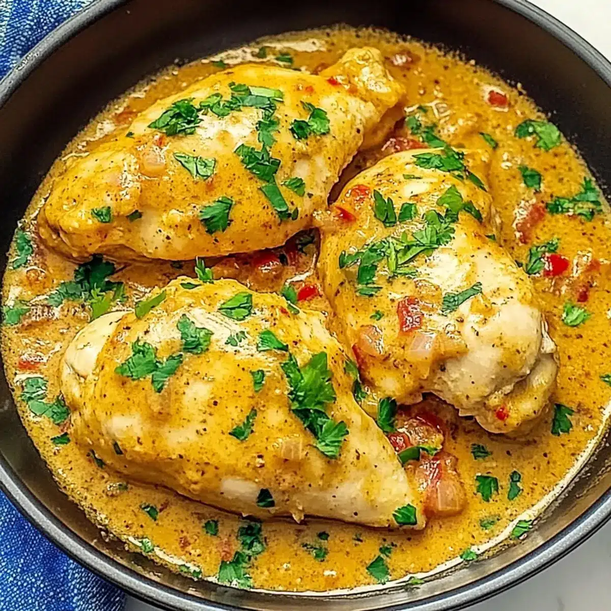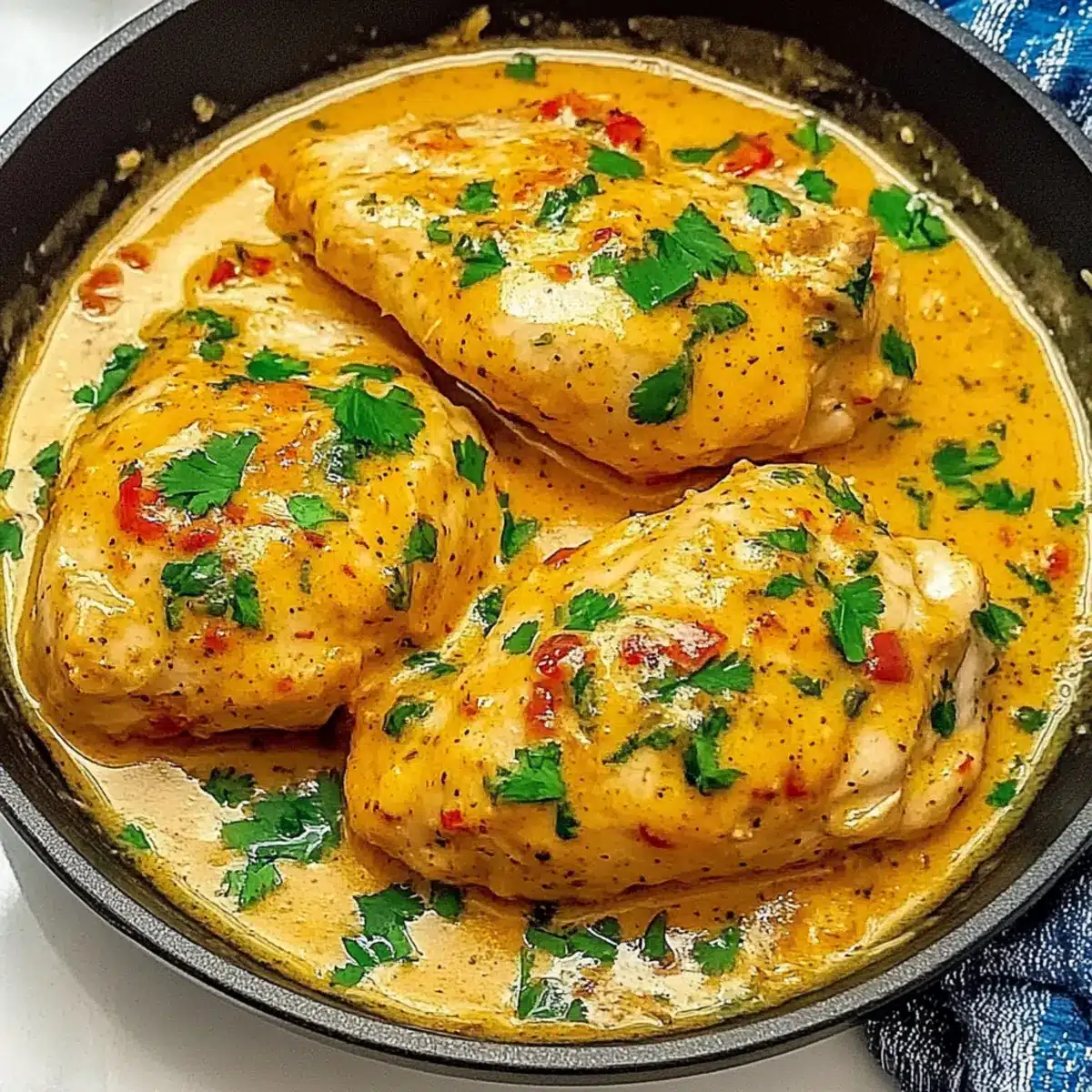 - Return chicken to the skillet, simmer for 5 minutes, and garnish with parsley or cilantro before serving.