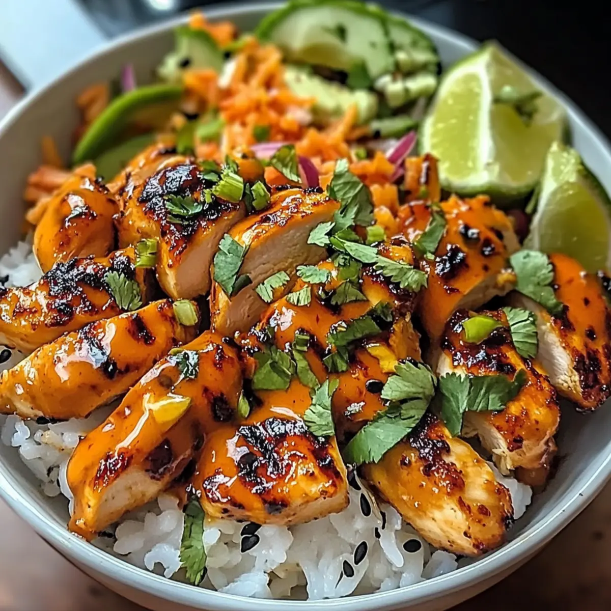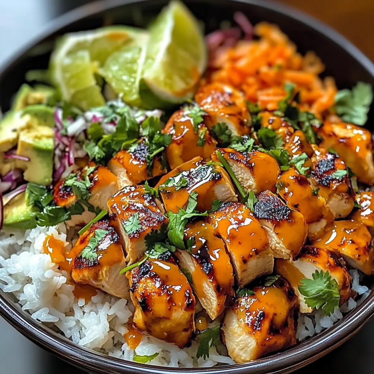 - To serve, place a scoop of coconut rice in each bowl, top with chicken, and drizzle with glaze. Garnish with optional toppings like cilantro, lime, coconut flakes, and green onions.
