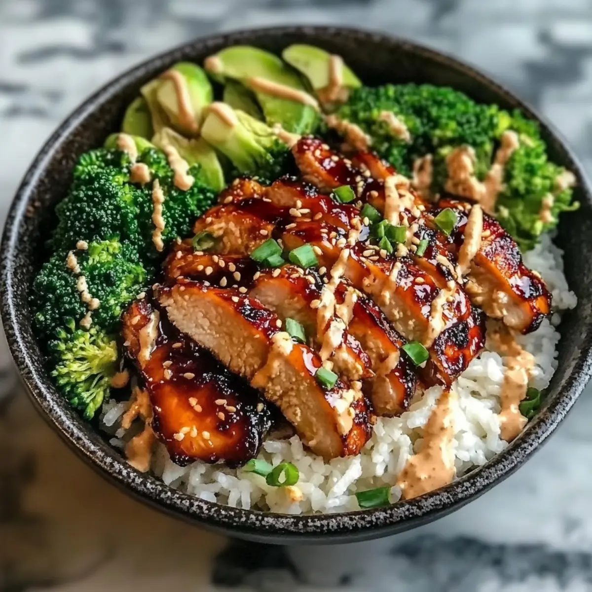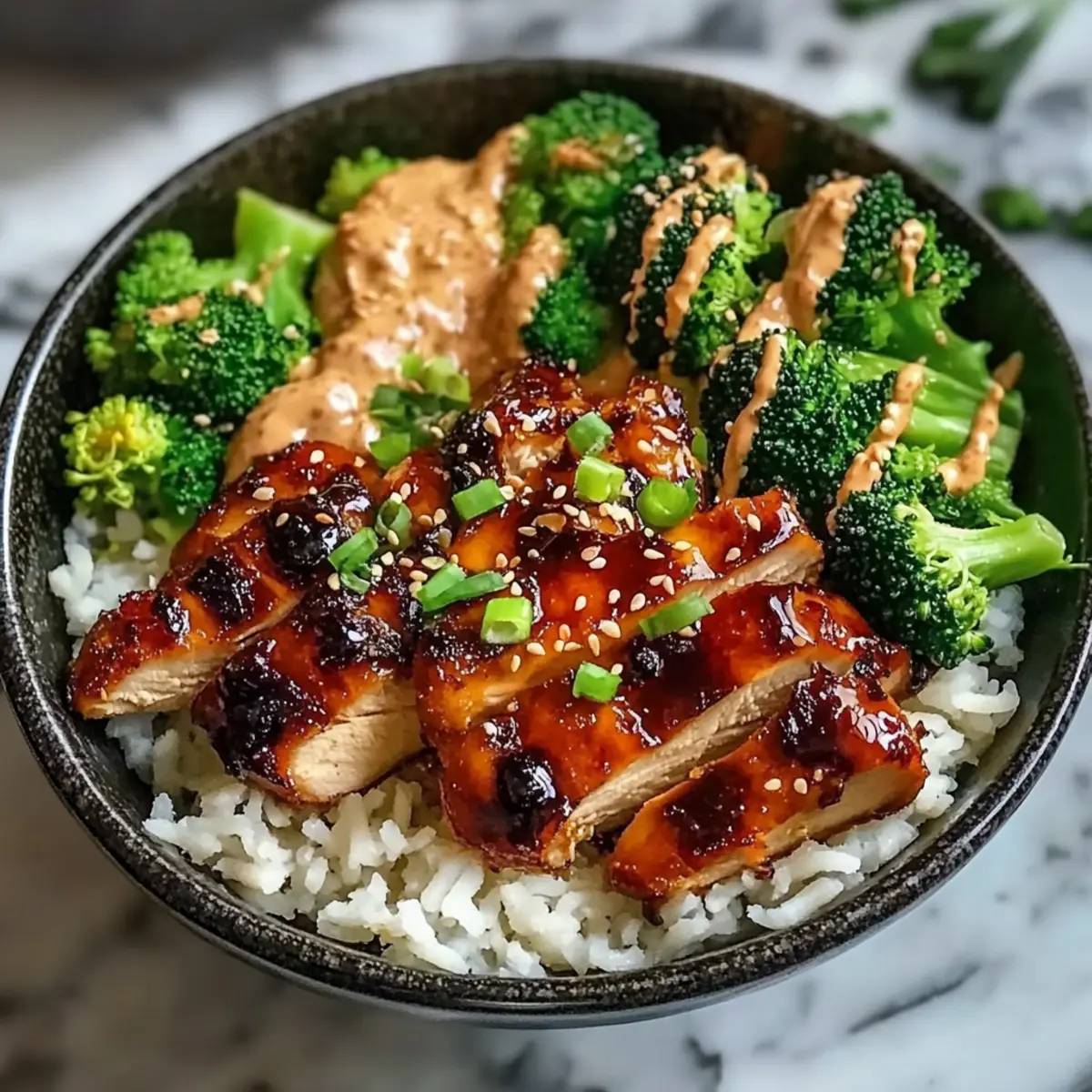 - Assemble the bowls with rice, sticky chicken, sautéed broccoli, drizzle with spicy mayo, and sprinkle sesame seeds.