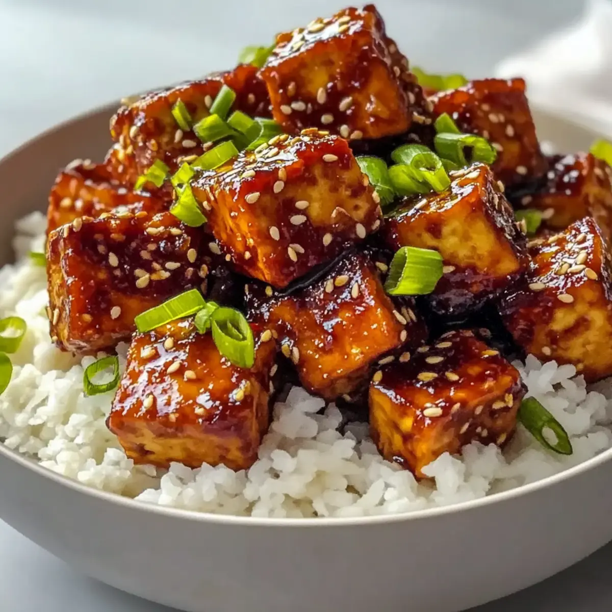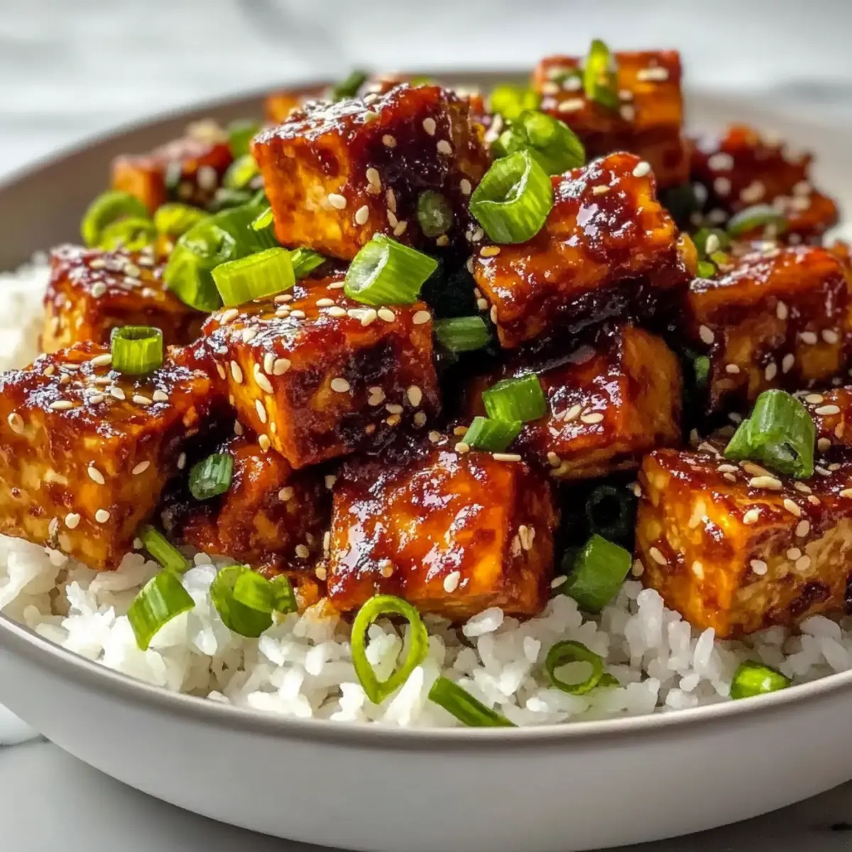 - Serve the tofu over jasmine rice or quinoa, garnished with green onions and sesame seeds.