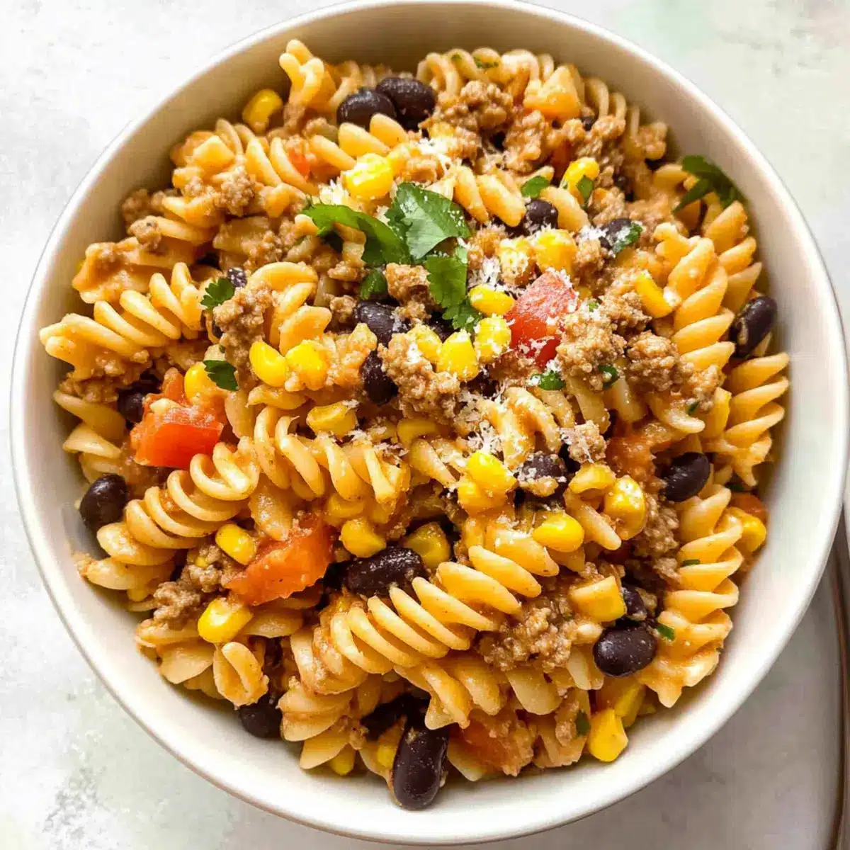 - In a large mixing bowl, combine cooled rotini, seasoned ground beef, chopped tomatoes, shredded cheddar, black beans, corn, and red onion. Toss gently to distribute evenly.
