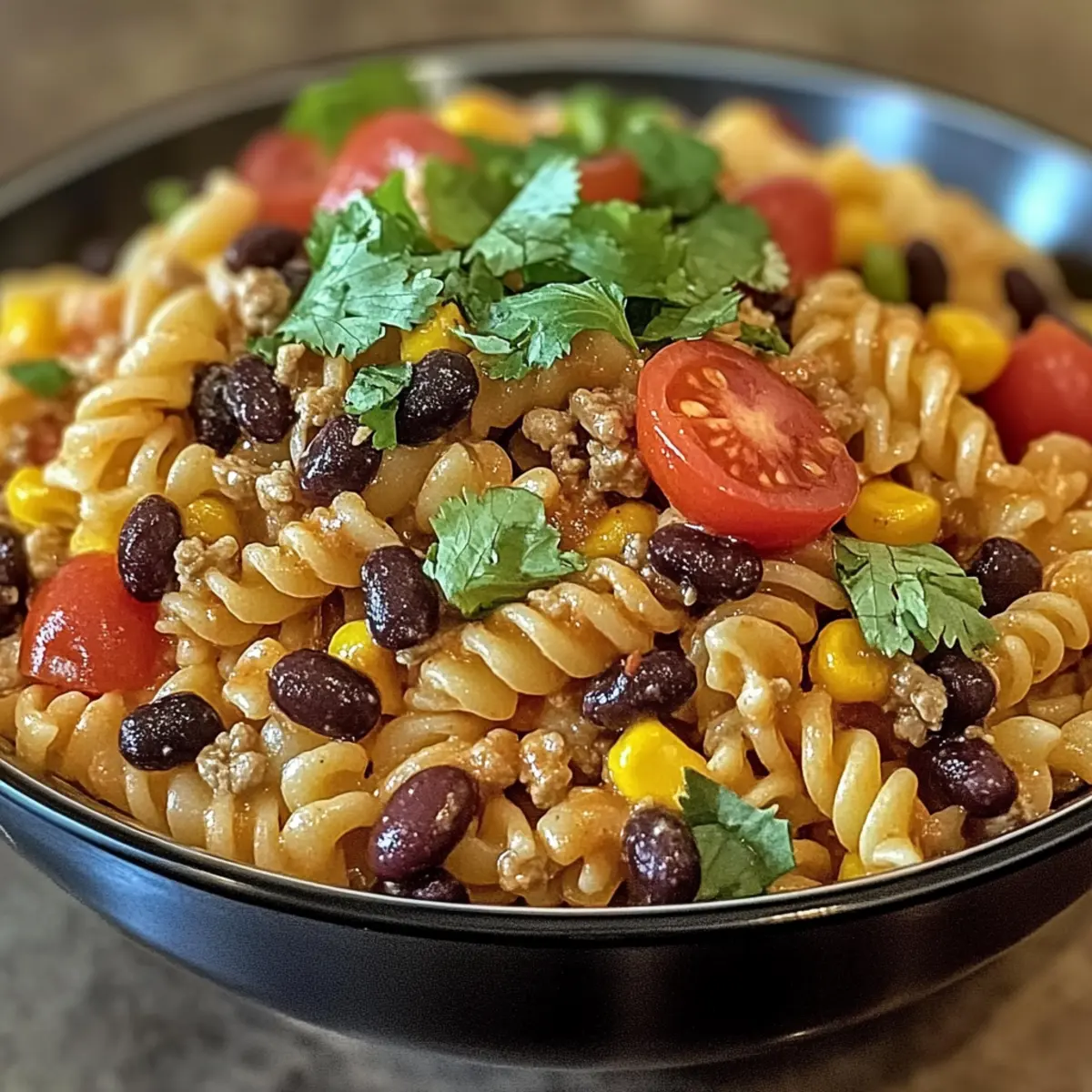 In a large mixing bowl, add the cooled pasta, chopped vegetables, black beans, corn, and cheese. Gently fold the ingredients together with a spatula, being careful not to break the pasta. Ensure all flavors are evenly mixed, creating a colorful medley that showcases the essence of your Taco Pasta Salad.