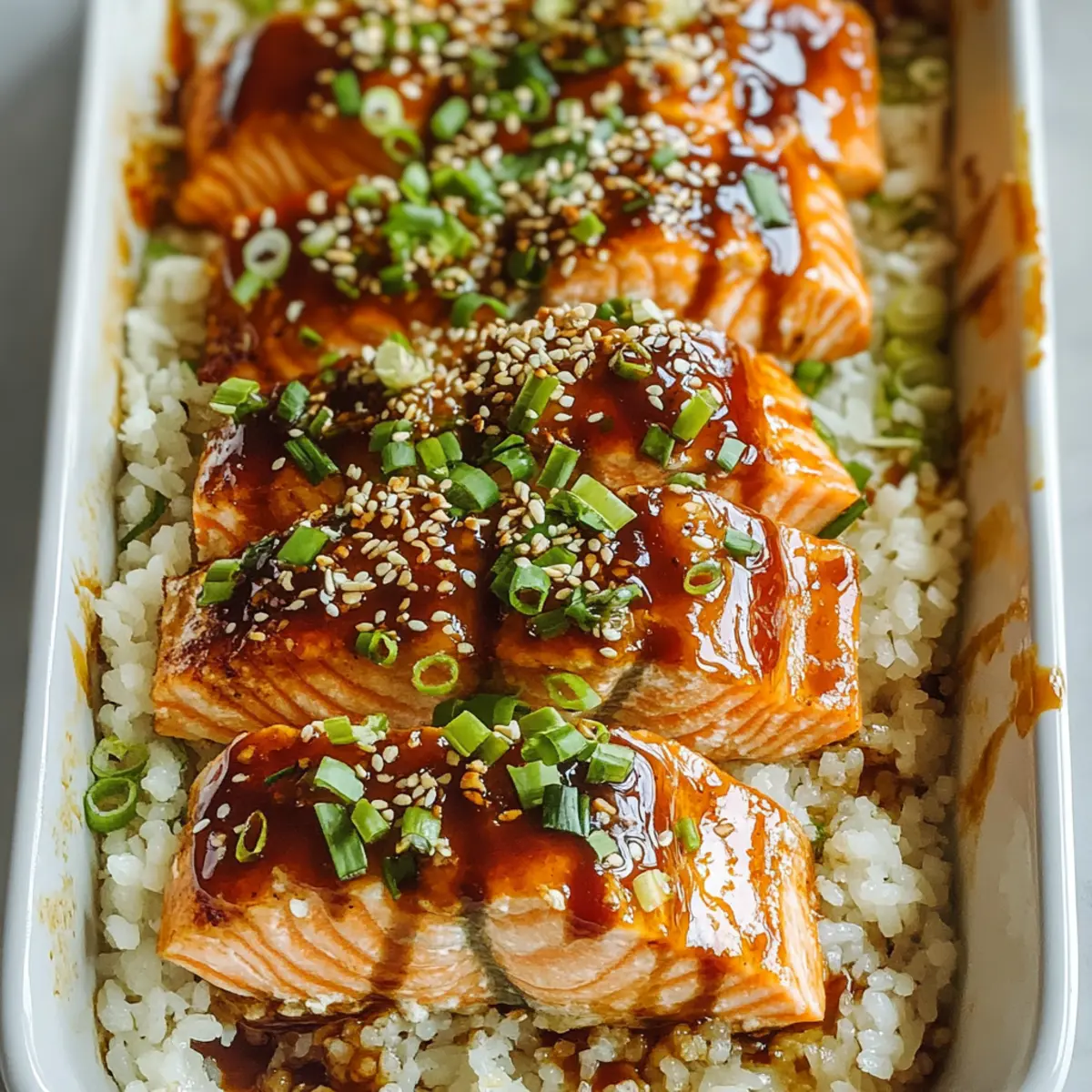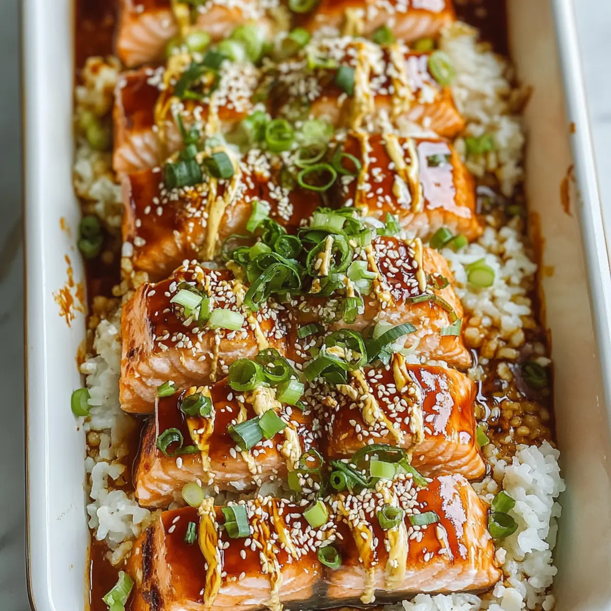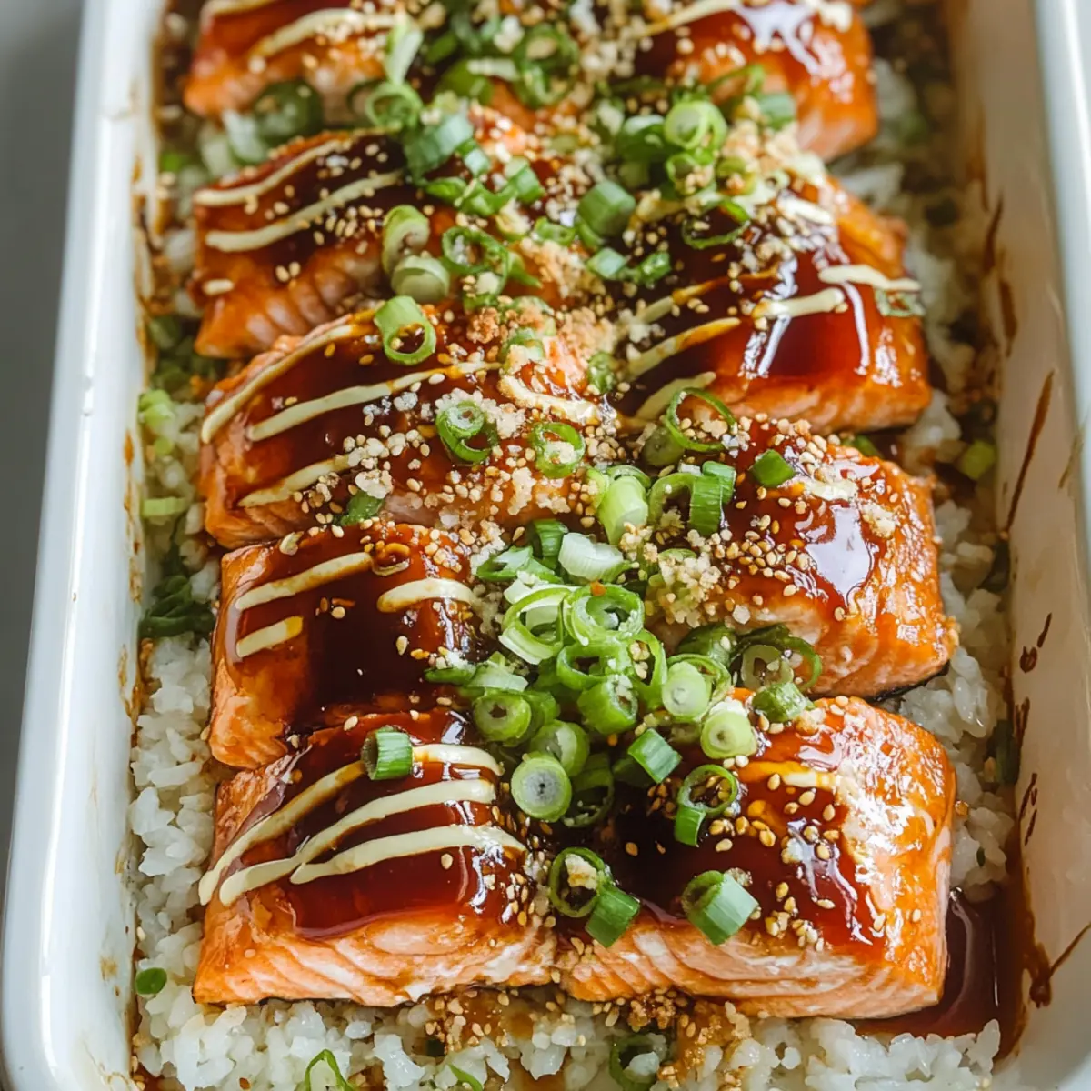 As your Teriyaki Salmon Sushi Bake comes out of the oven, drizzle it with extra teriyaki sauce for a finishing touch. Sprinkle sesame seeds and additional green onions on top for beautiful presentation. These garnishes not only enhance the dish visually but also add lovely texture and flavor.