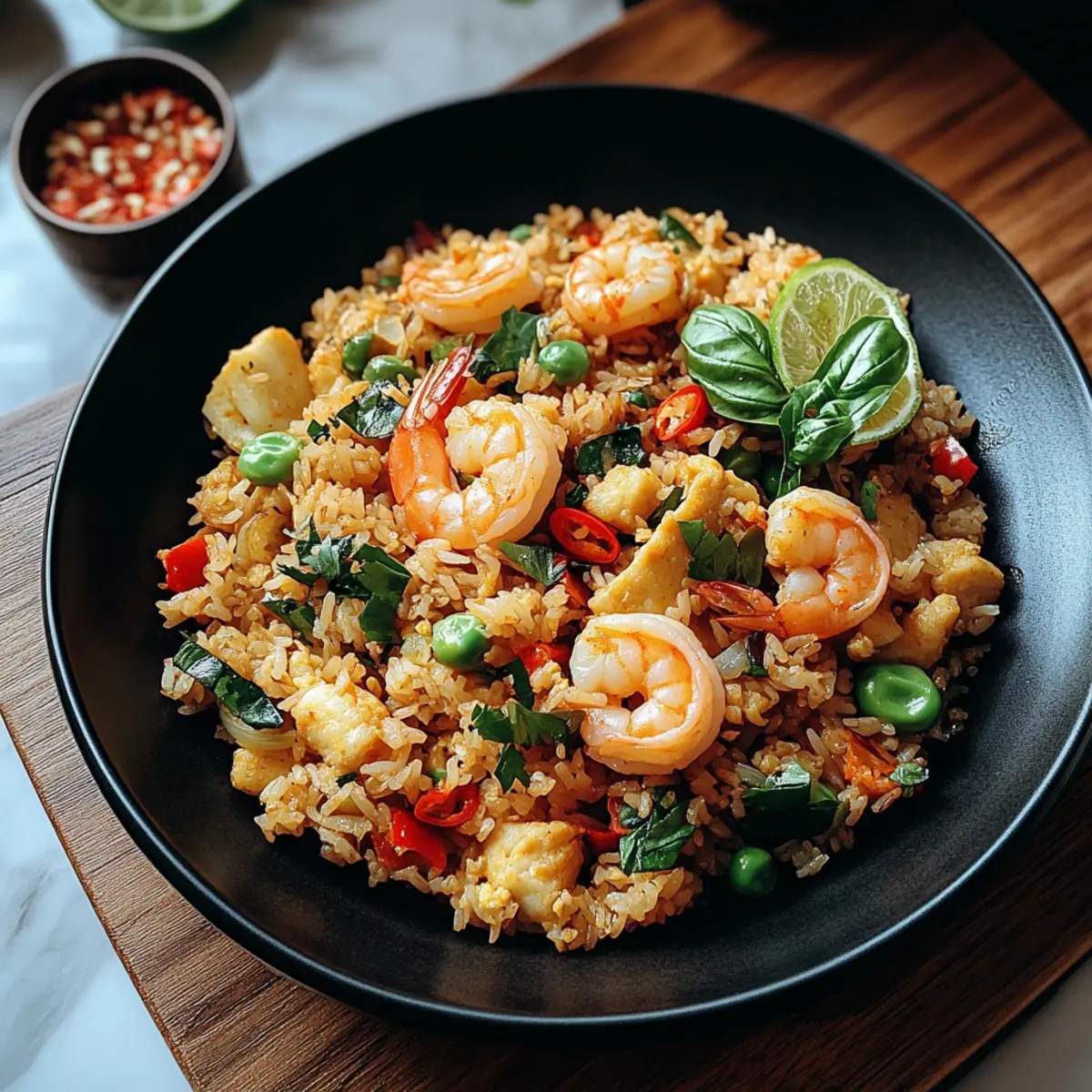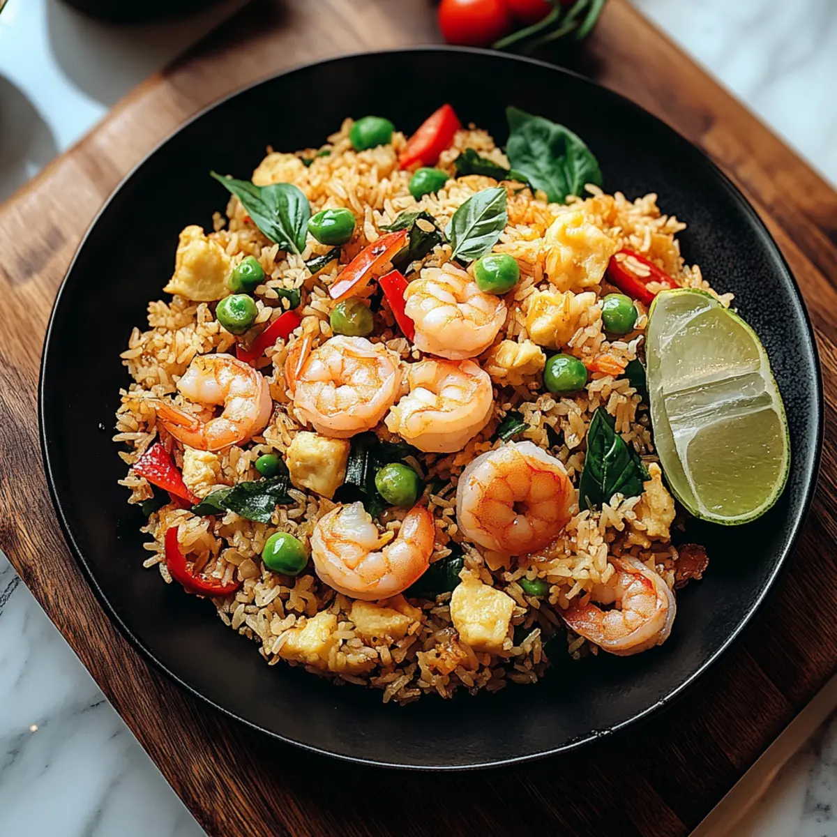 Remove the wok from heat and plate your delicious Thai Basil Fried Rice immediately. Serve hot, garnished with a fresh squeeze of lime juice if desired. This dish not only looks appetizing but also embodies the warmth and comfort of Thai street food, inviting everyone to dig in and savor those delightful flavors!