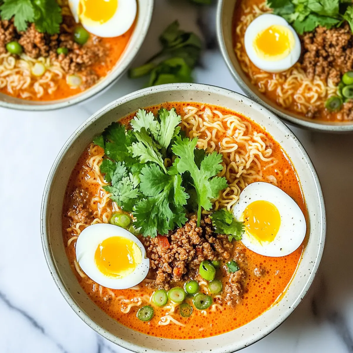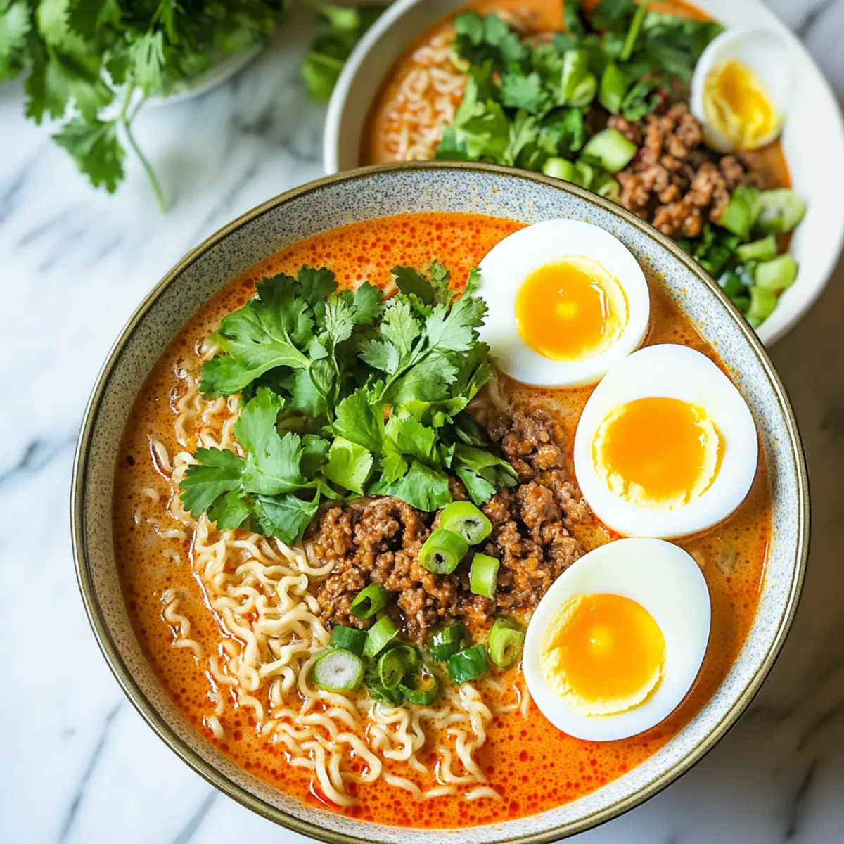 - Distribute cooked ramen noodles into bowls, pour broth over noodles, and top with ground pork, soft-boiled eggs, cilantro, green onions, and sesame seeds. Enjoy!