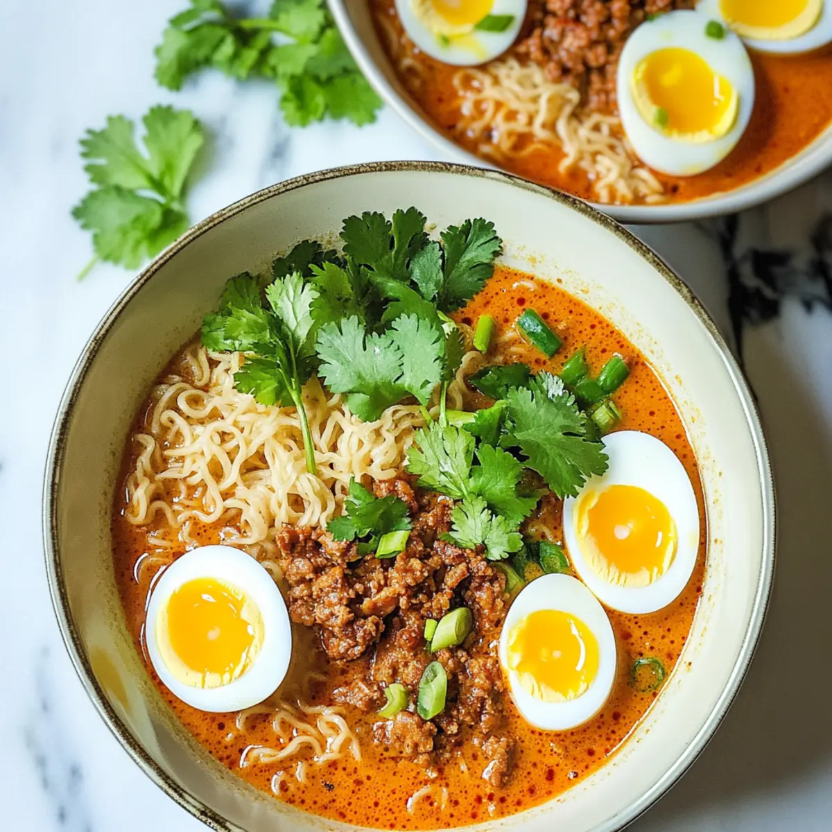 To assemble your Thai Coconut Curry Ramen, distribute the cooked ramen noodles evenly among serving bowls. Pour the luxurious broth over the noodles, ensuring each bowl gets a generous helping of the creamy mixture. Top each serving with the sautéed ground pork, halved soft-boiled eggs, fresh cilantro leaves, sliced green onions, and a sprinkle of toasted sesame seeds for an irresistible finish. Enjoy this heartwarming meal!