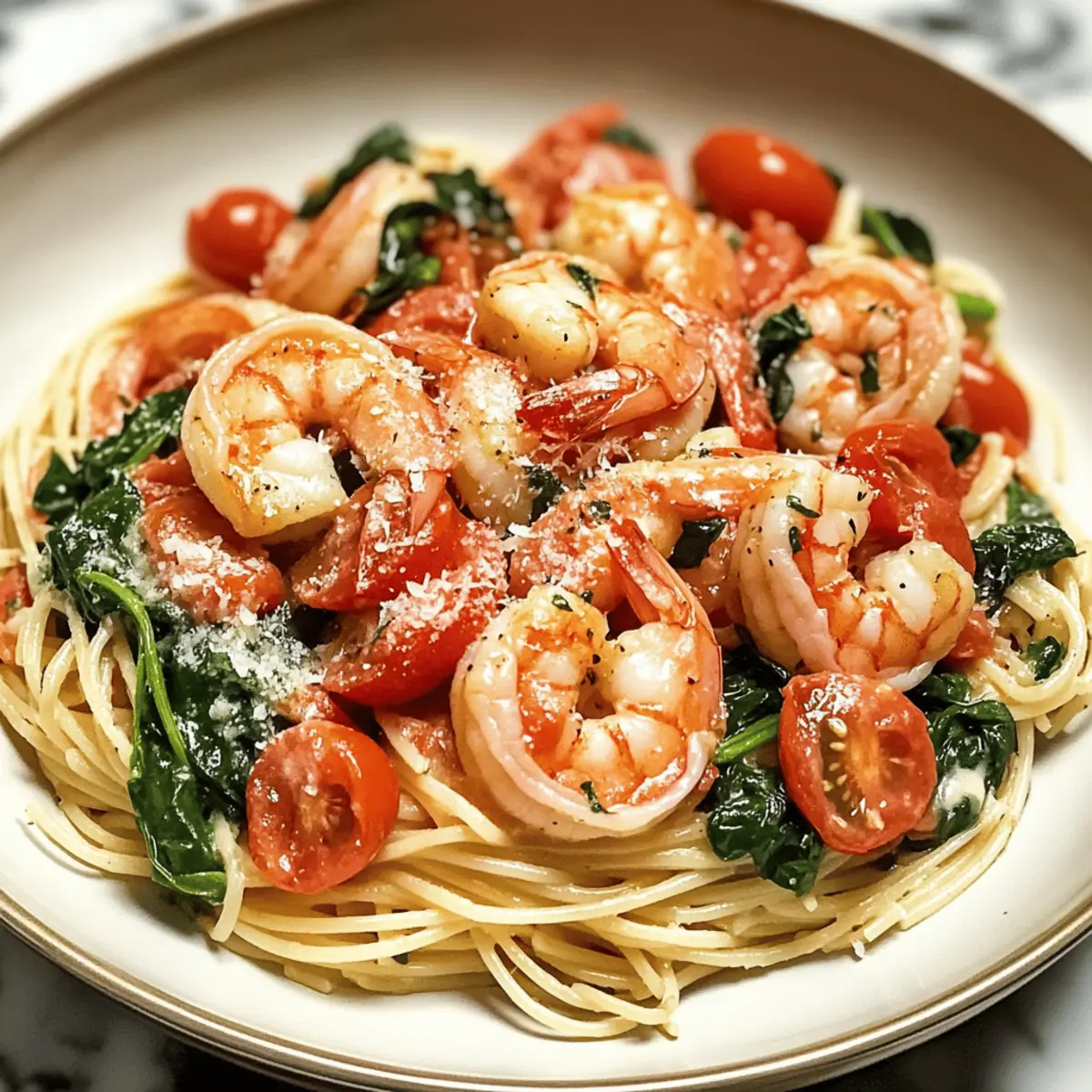 - Plate your Tomato Spinach Shrimp Pasta immediately, garnishing with freshly grated Parmesan cheese.