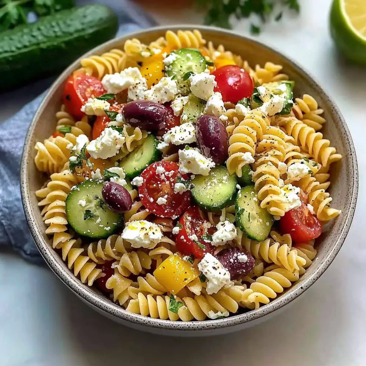 Definitely! If you or your guests have allergies, be cautious with the olives and feta, as they can be sources of allergens. Always check for lactose intolerance with the feta cheese, and if you’re preparing it for vegetarians, confirm the dressing does not contain any unwanted ingredients. For a gluten-free option, substitute rotini with gluten-free pasta!
