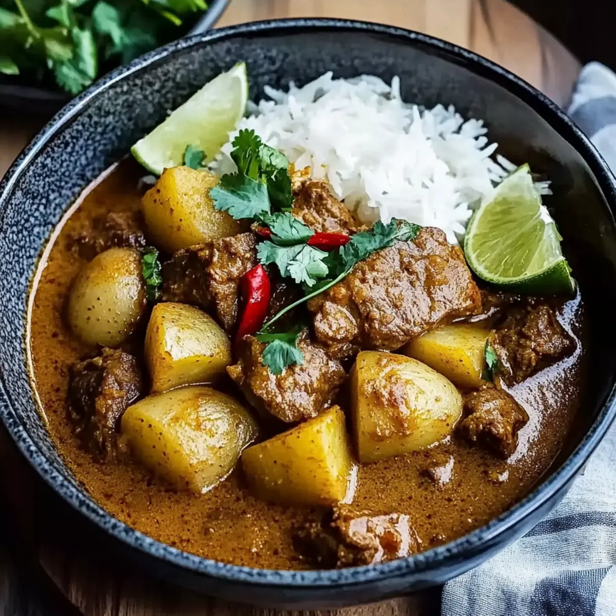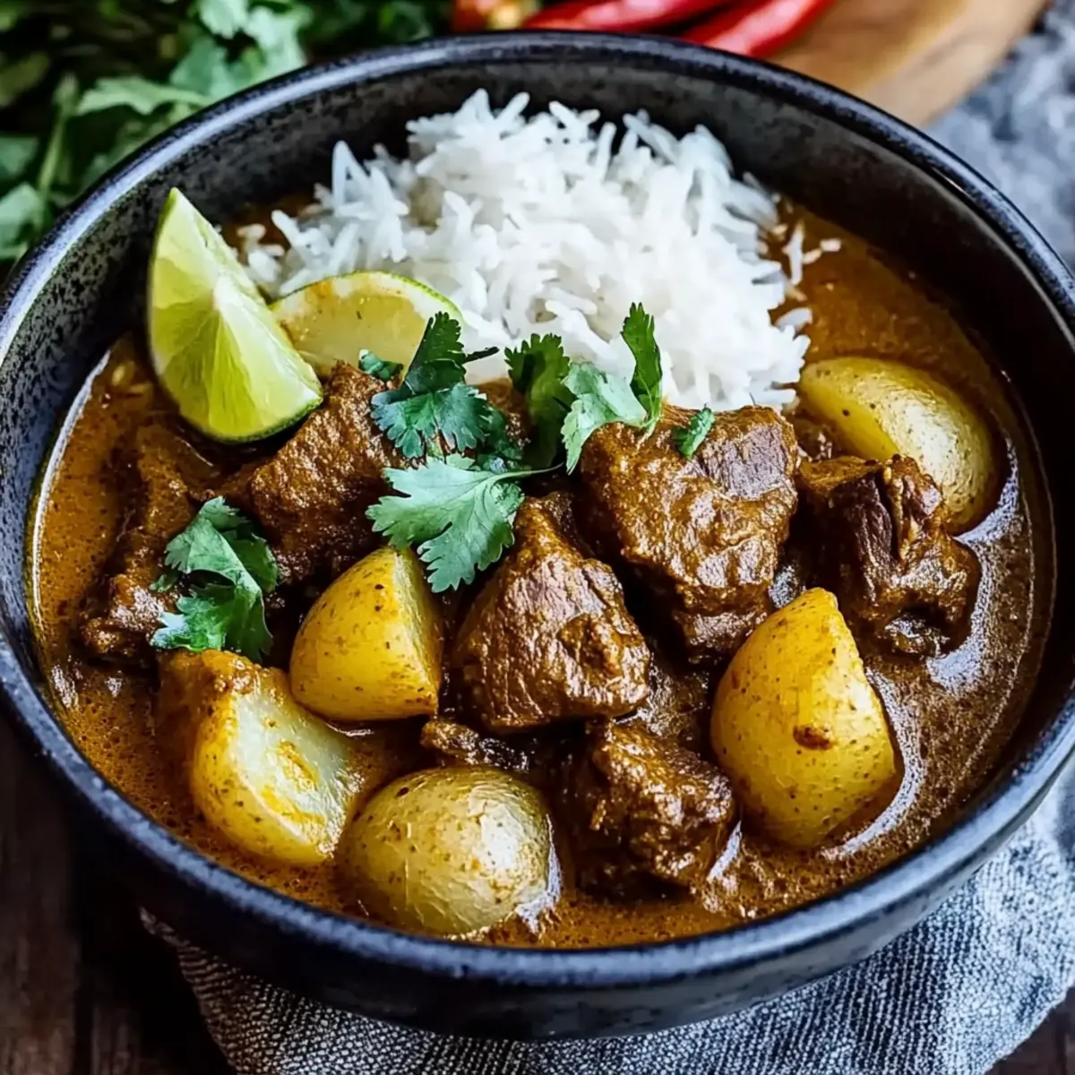Once everything is cooked, stir in the lime juice to brighten the flavors. Serve the curry hot over a bed of steamed rice, garnishing with chopped fresh coriander, sliced red chillies for heat if desired, and lime wedges for that extra pop of citrus. This final touch will elevate your Ultimate Beef Massaman Curry, making it a perfect meal for sharing with loved ones.